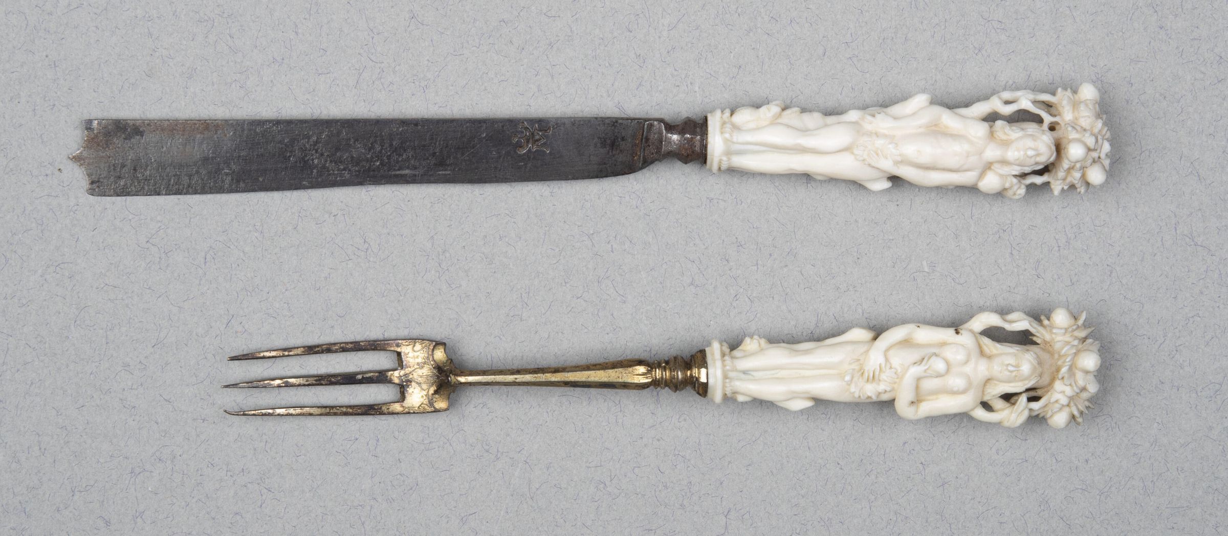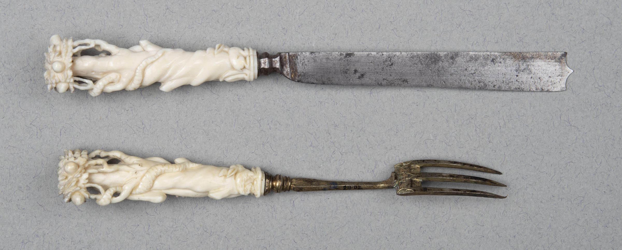 Handles: Ivory; each carved to represent a serpent-entwined apple tree with a rabbit at its base, behind the figures of Adam (on the knife) and Eve (on the fork) after the Fall. The serpent has an apple in its mouth.Collection