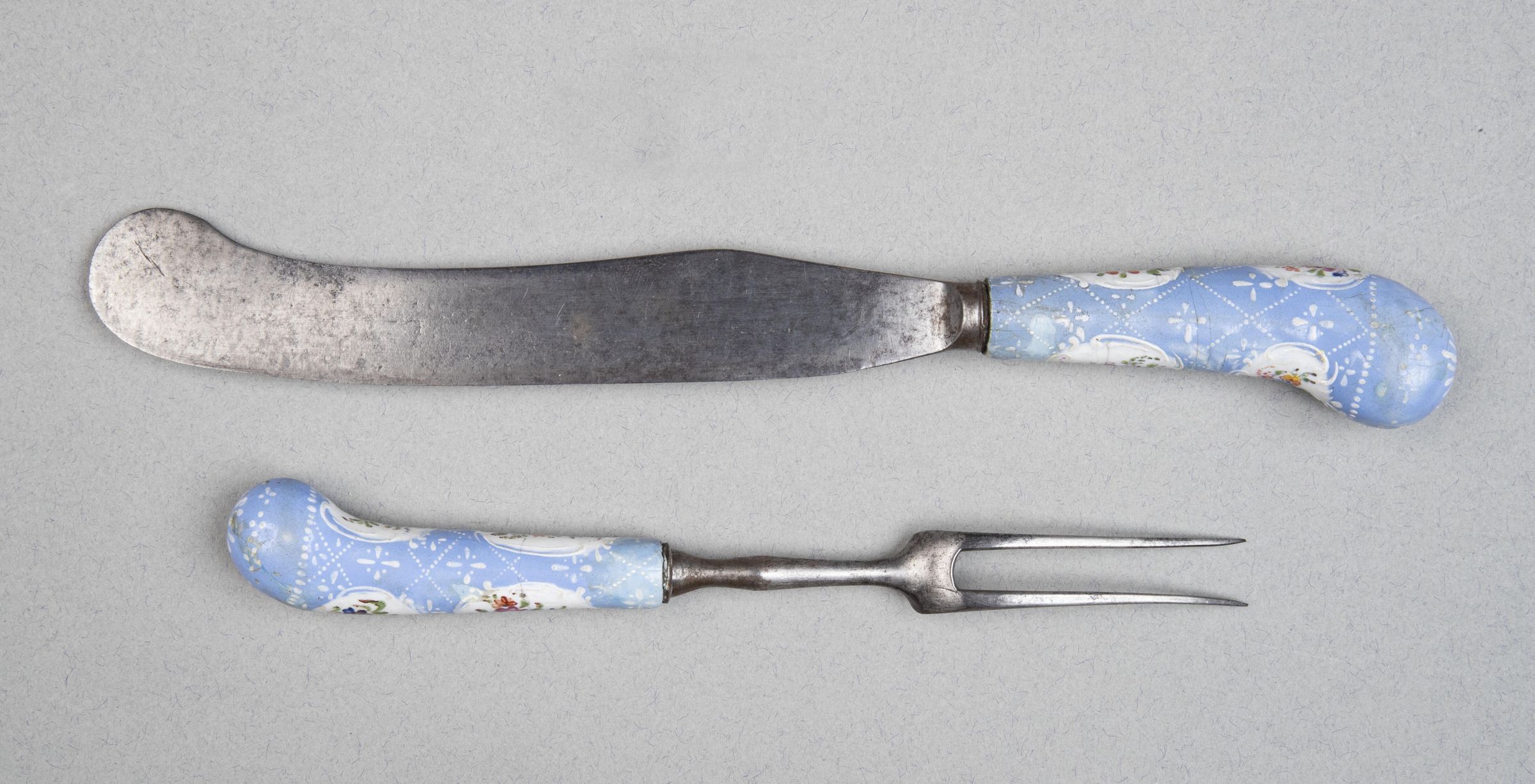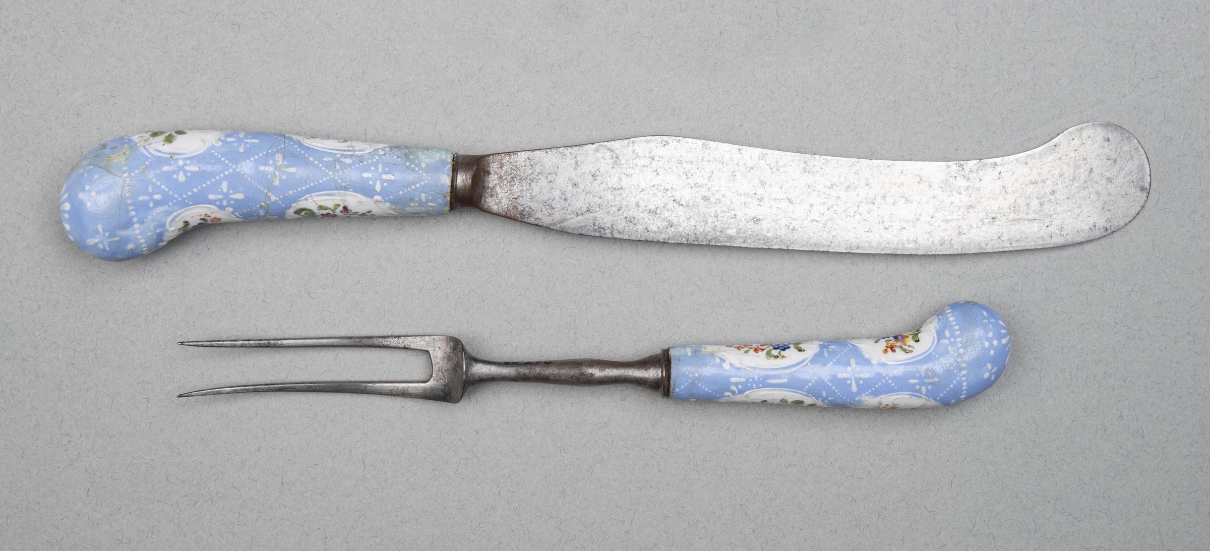 Handles: Pistol-shaped, of enamelled copper, coloured blue, covered with a trellis pattern in white, containing conventional white quatrefoil flowers; four white rococo cartouches contain sprays of flowers painted in natural colours.Collection