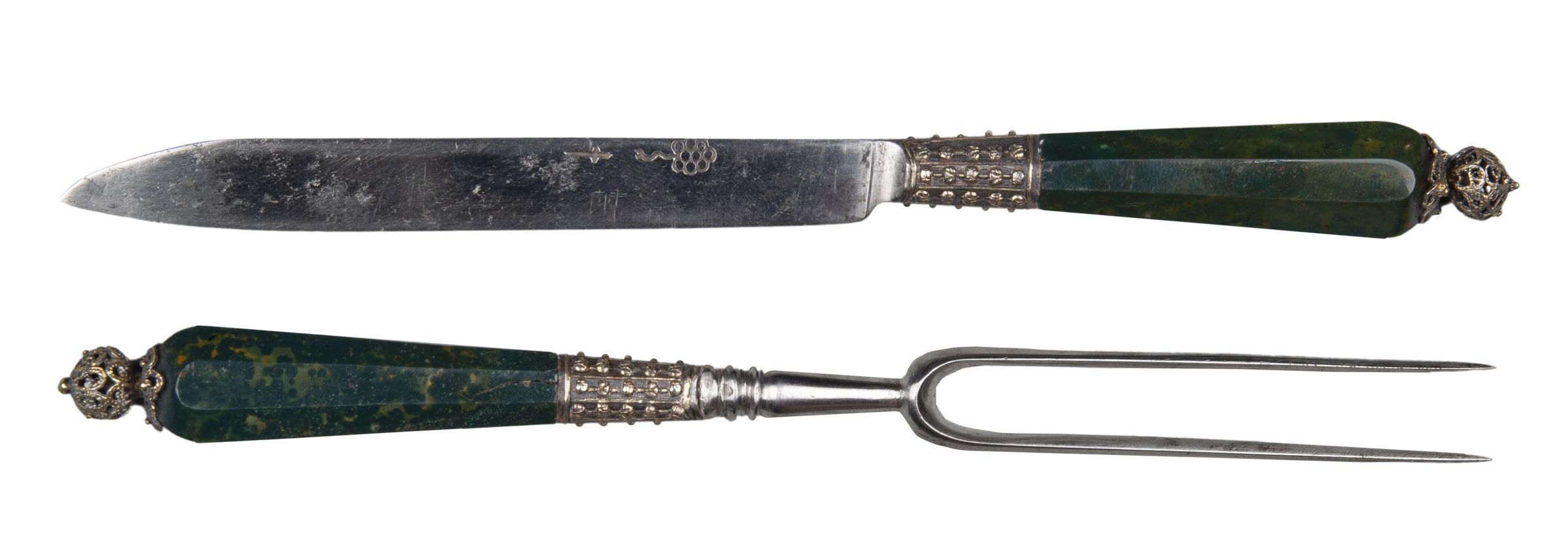 Handles: Flattened, flaring octagons of bloodstone with silver-gilt filigree ball finials. Steel ferrules encrusted with silver-gilt ornament.Collection