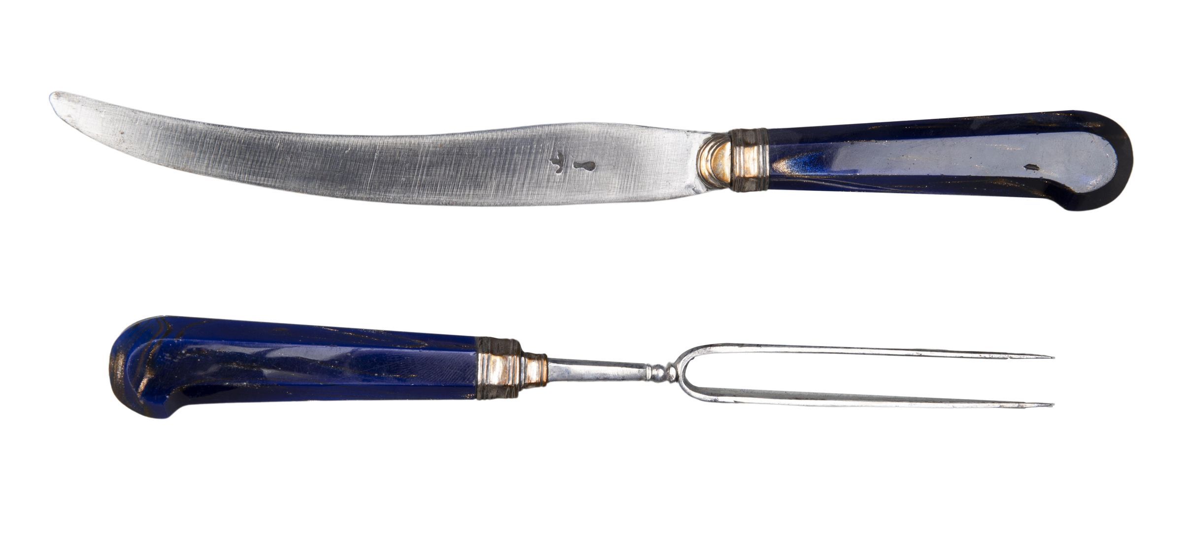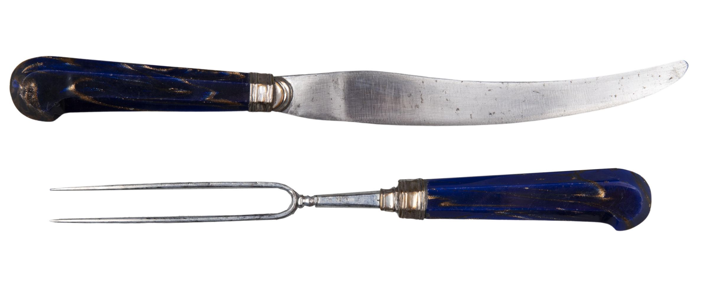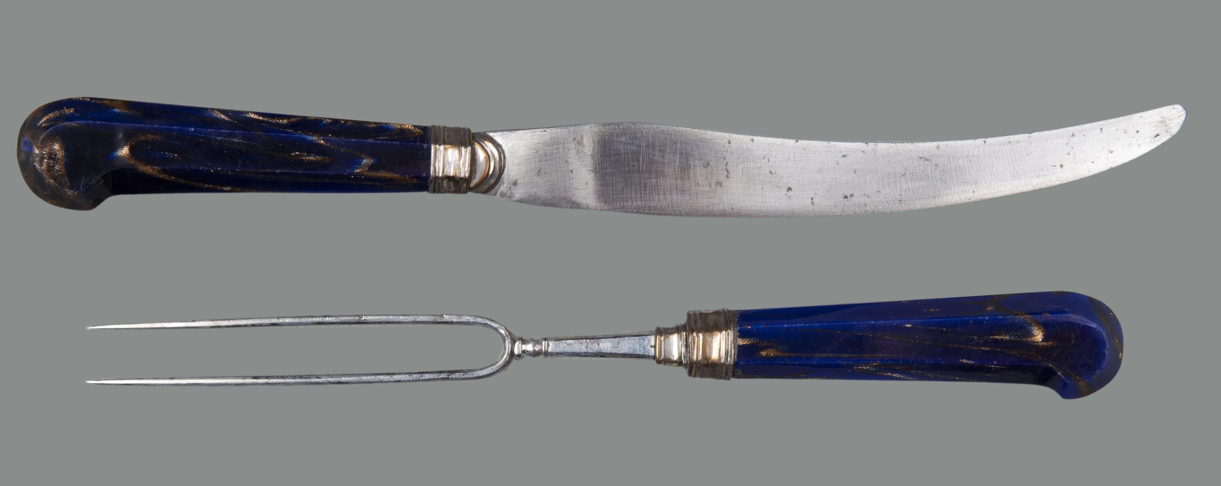 Handles: Peaked pistol-grip shape, of blue Aventurine glass, flecked with copper filings, of flattened oval section, ferrules bordered by low mouldings, and buttons, both of silver; the ferrules have a small extension over the bases of both the blade and neck of the fork.Collection