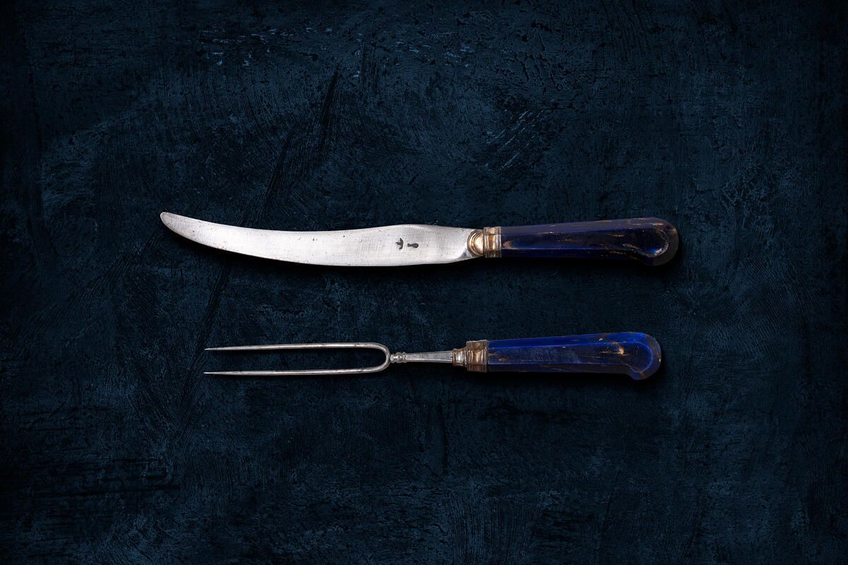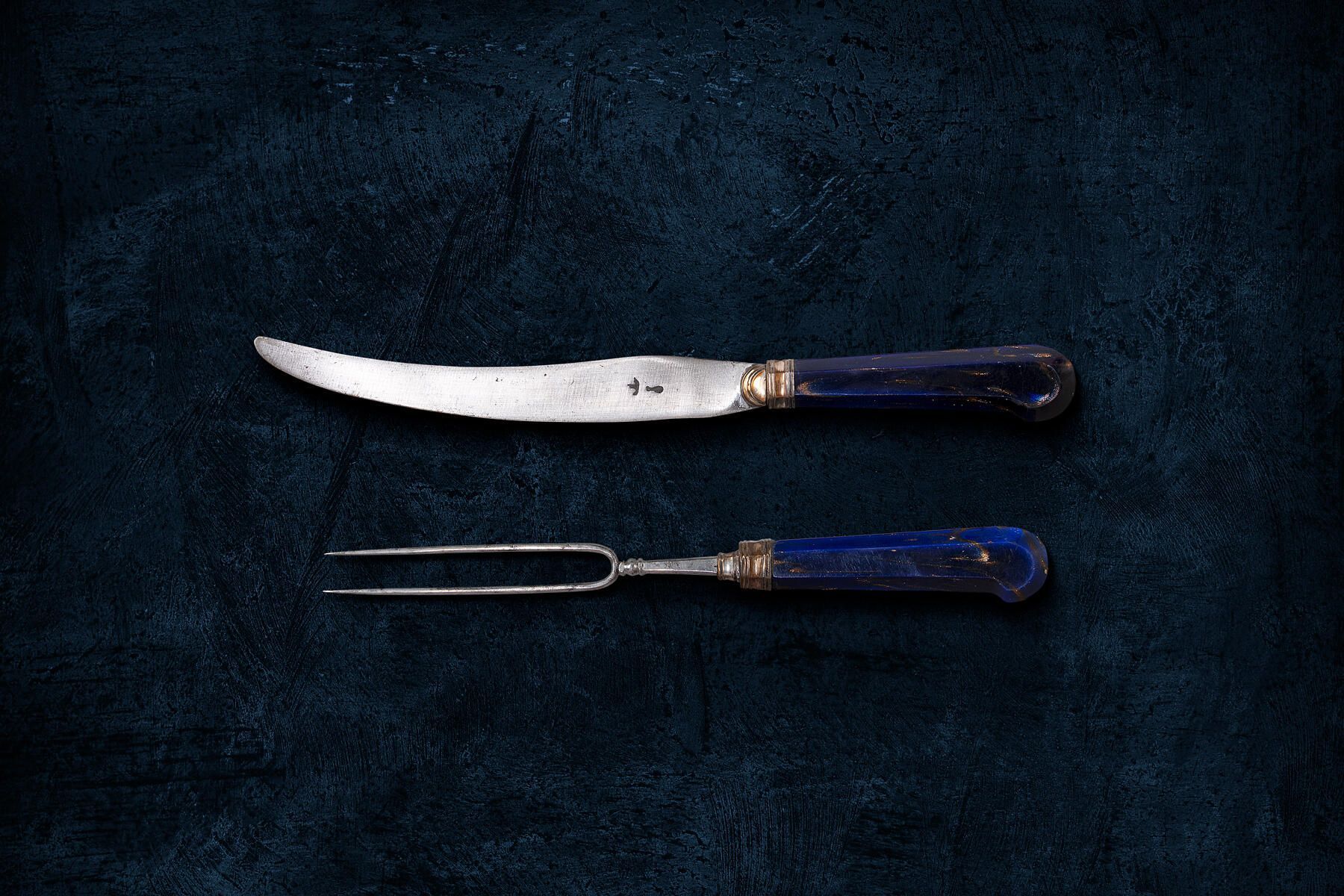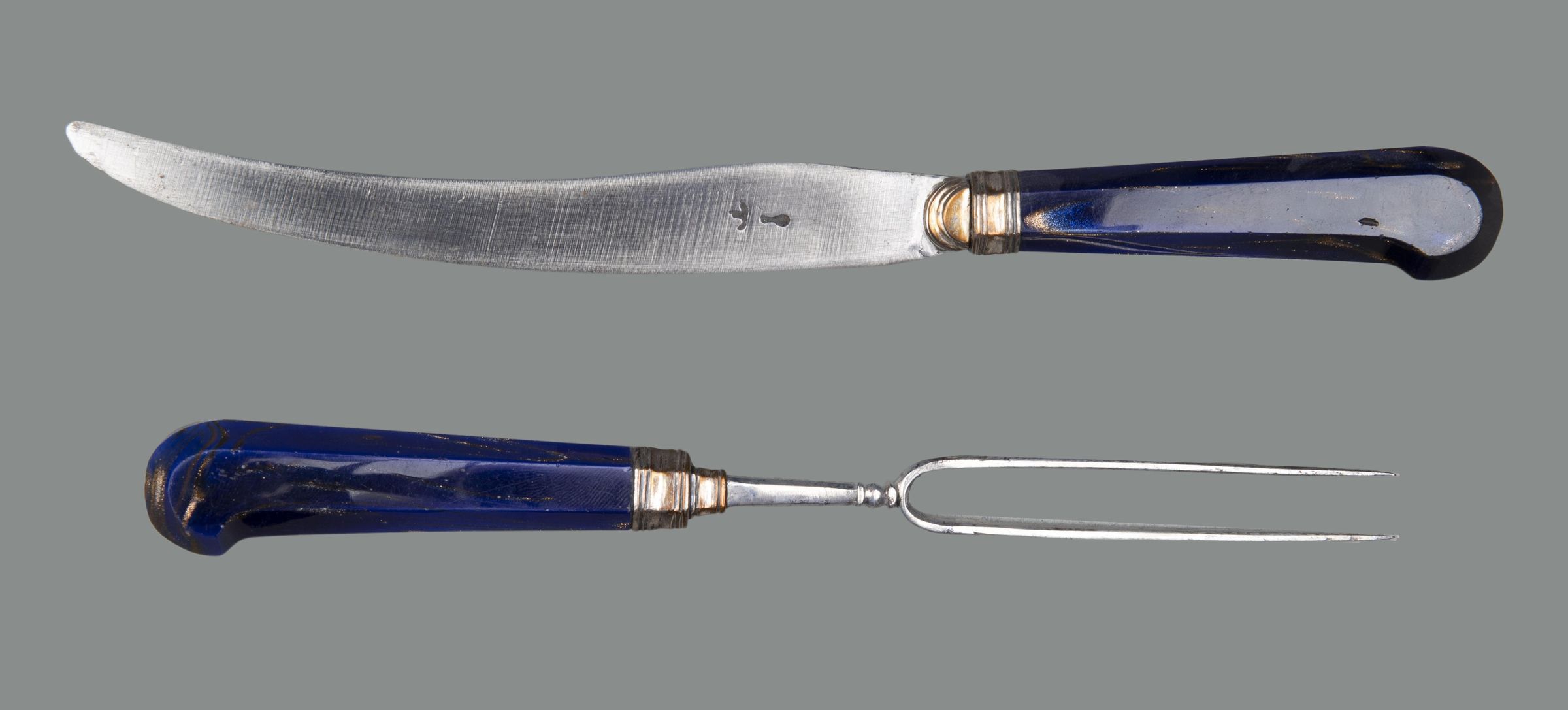 Handles: Peaked pistol-grip shape, of blue Aventurine glass, flecked with copper filings, of flattened oval section, ferrules bordered by low mouldings, and buttons, both of silver; the ferrules have a small extension over the bases of both the blade and neck of the fork.Collection
