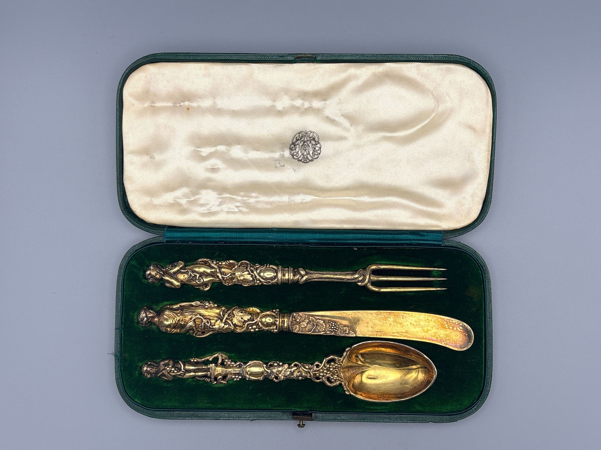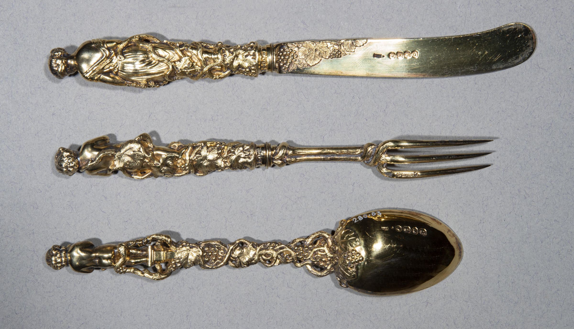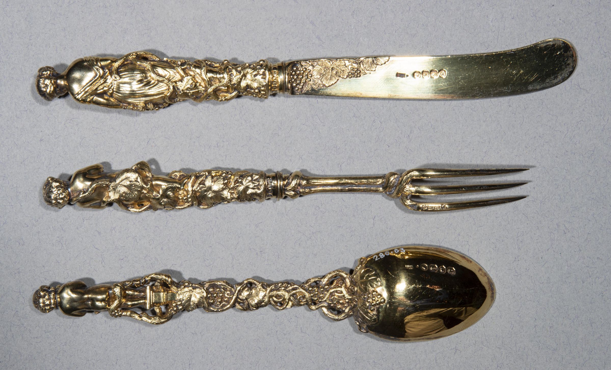 Handles: Cast in the form of bacchante entwined with vines, naked putti (of different design) on spoon and fork, and a woman on knife. All are made as a set, cast in solid silver and gilded.