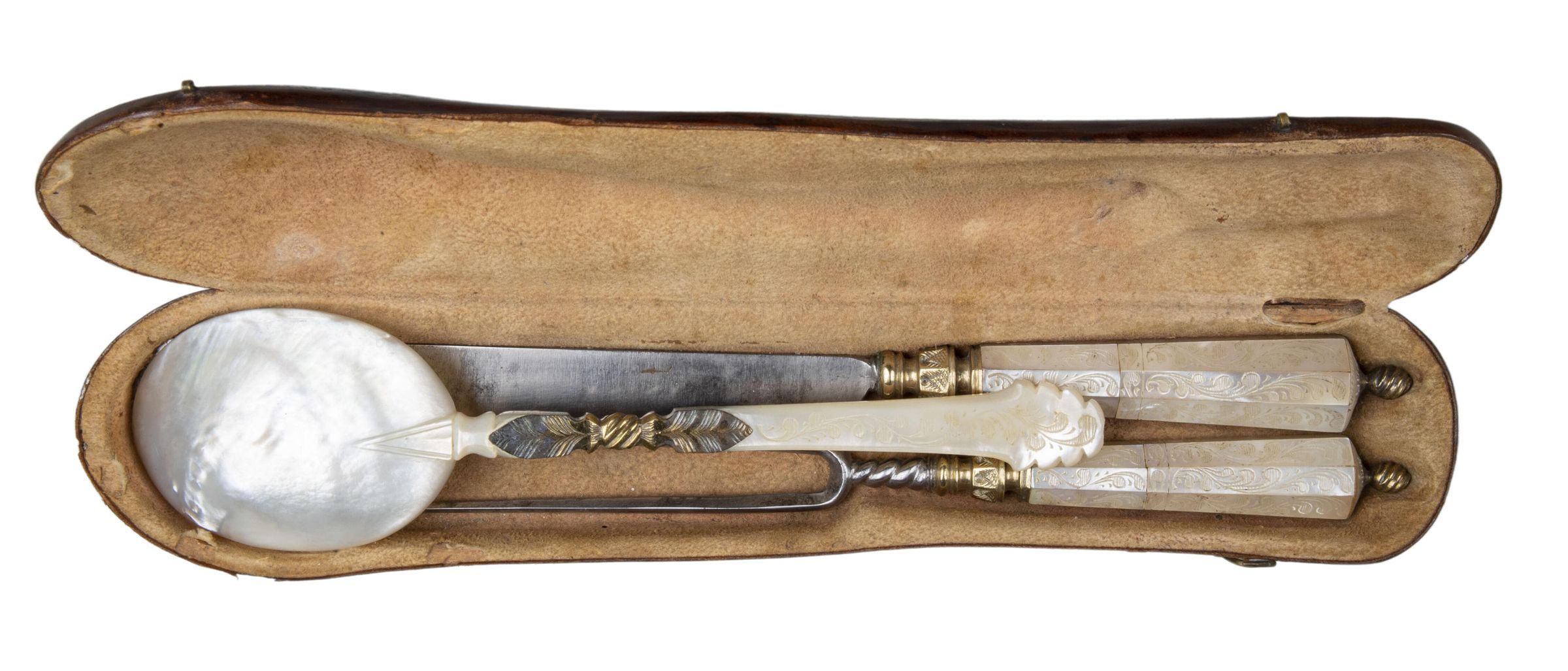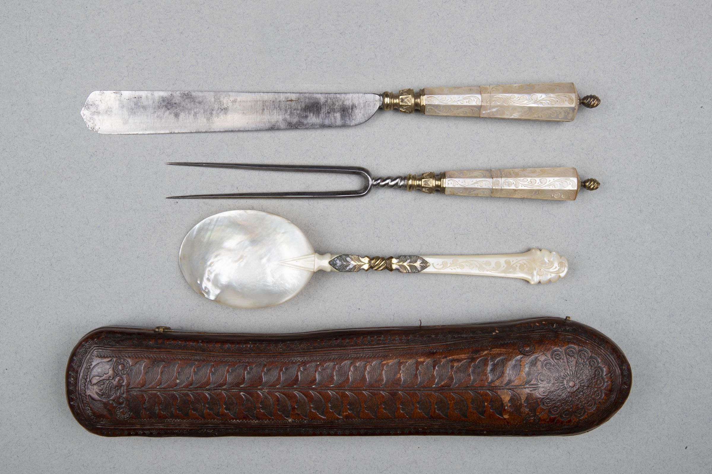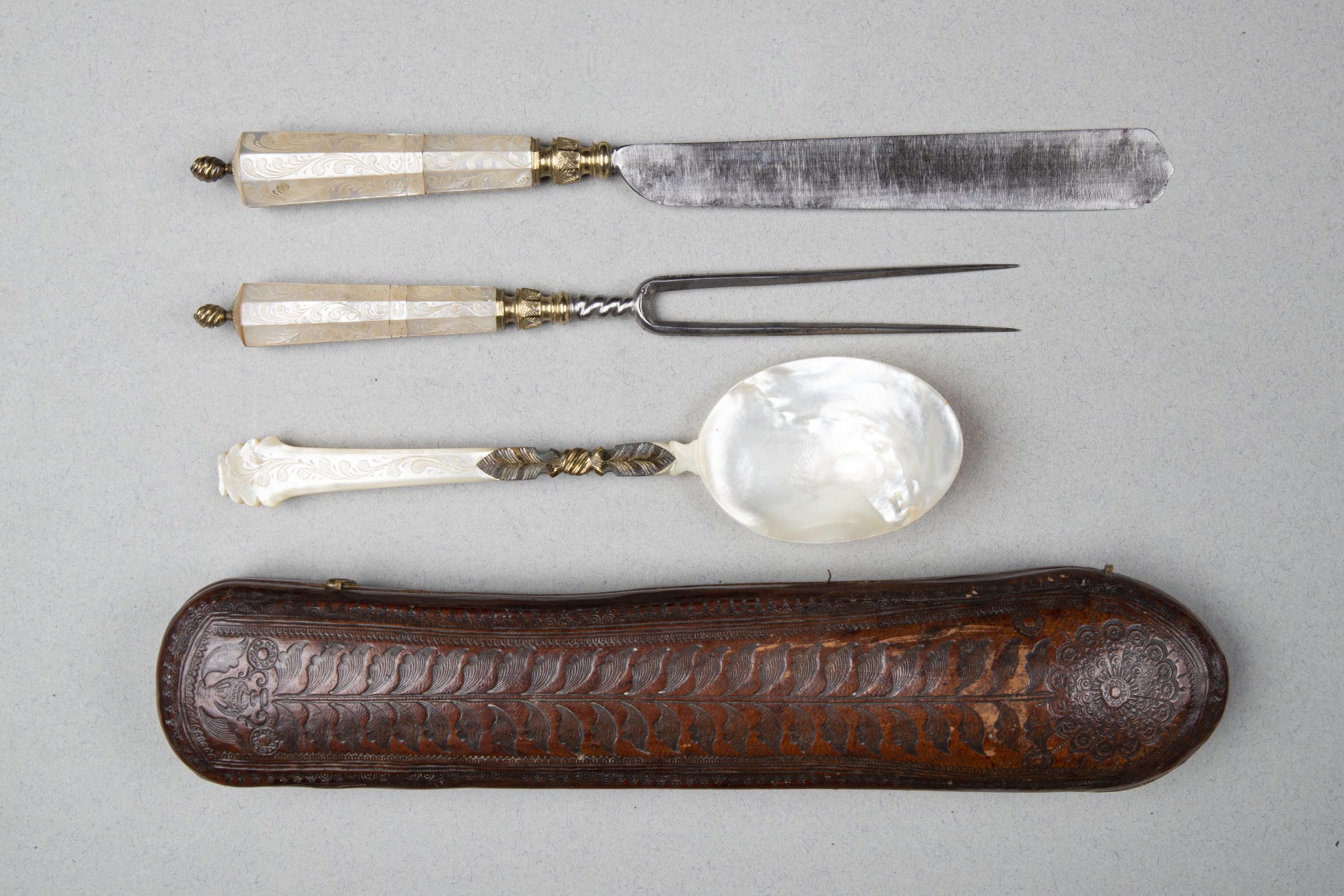 Handles: The elaborate silver-gilt bolsters of both fork and knife doubly waisted and with a central plain octagonal moulding engraved with stylized leaves. The flaring octagonal handles of mother-of-pearl engraved with scrolling foliage. The writhen knop finials of silver gilt.