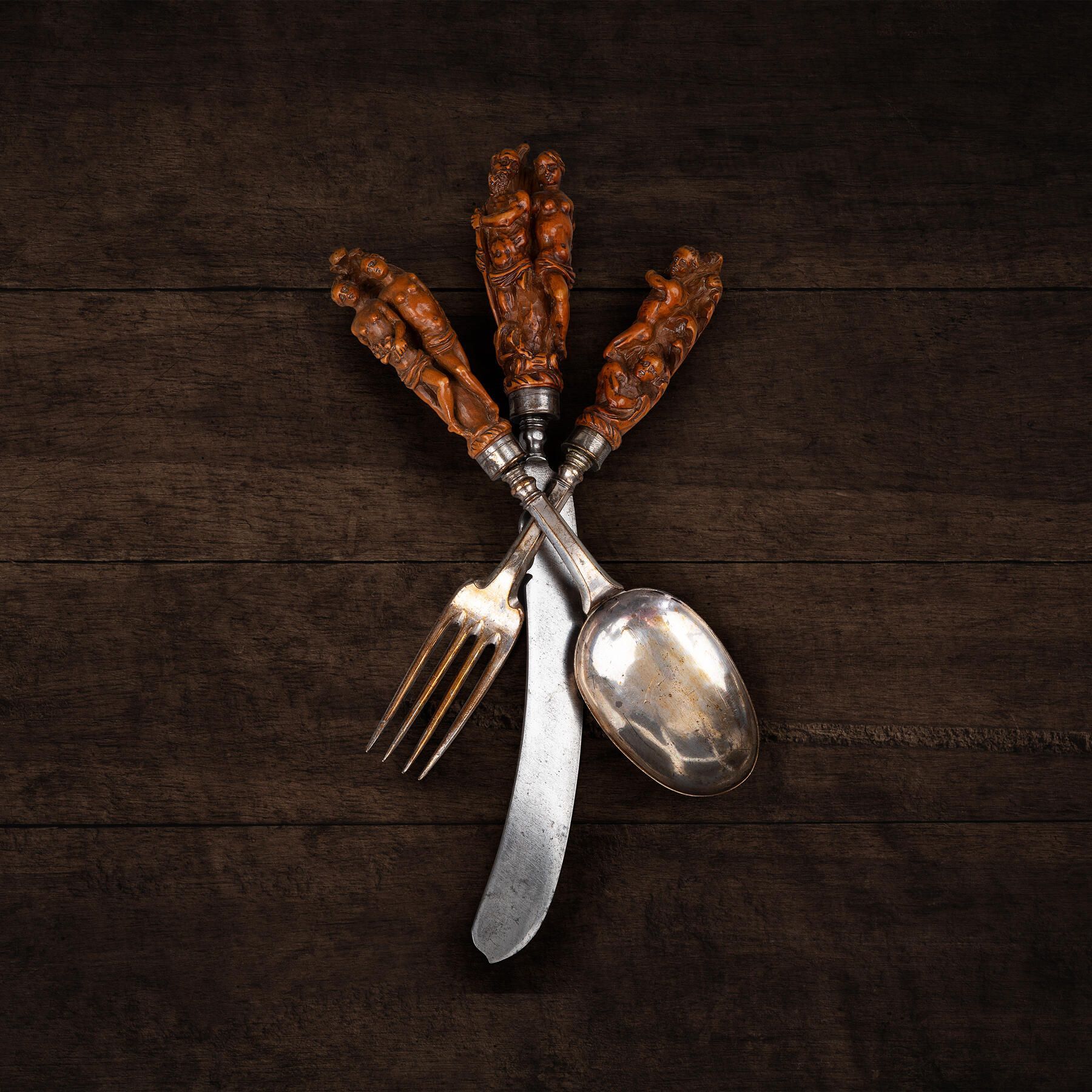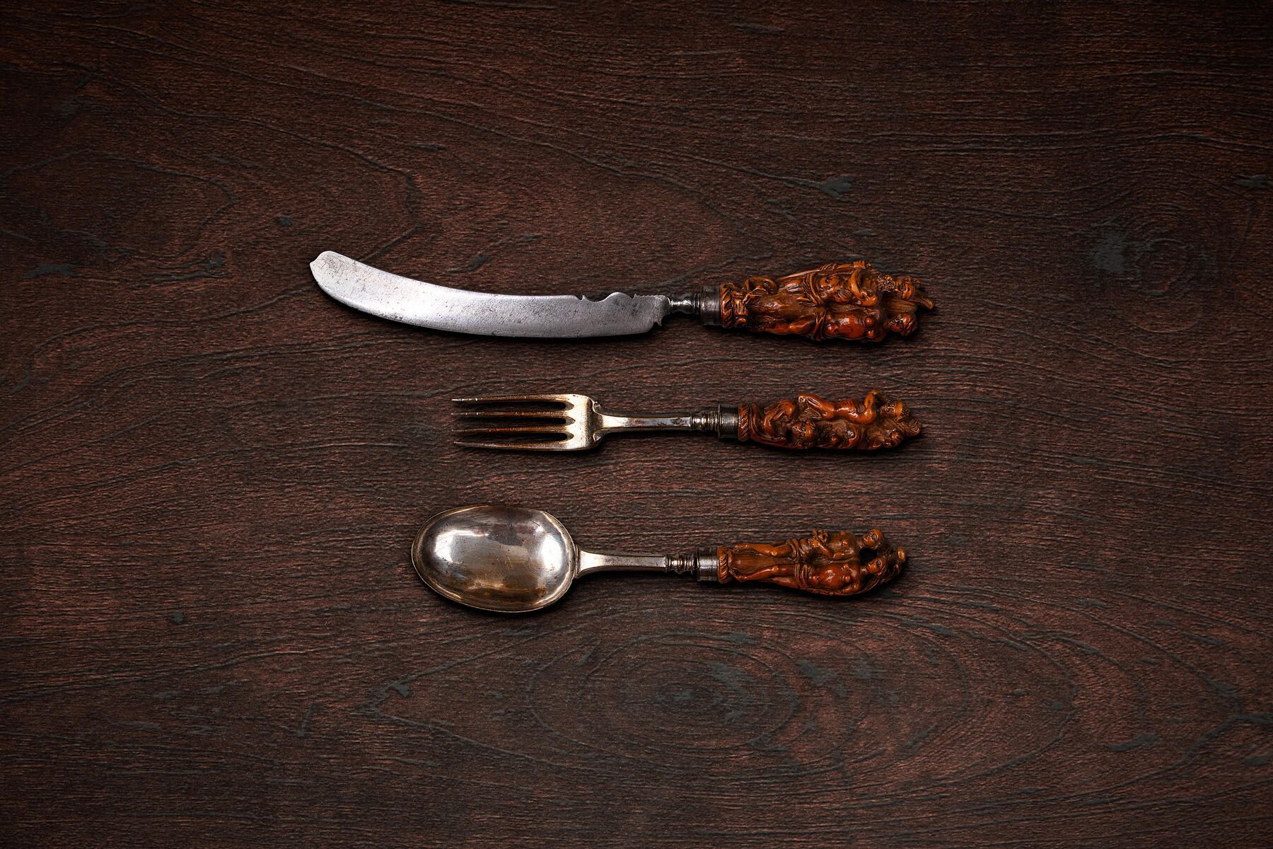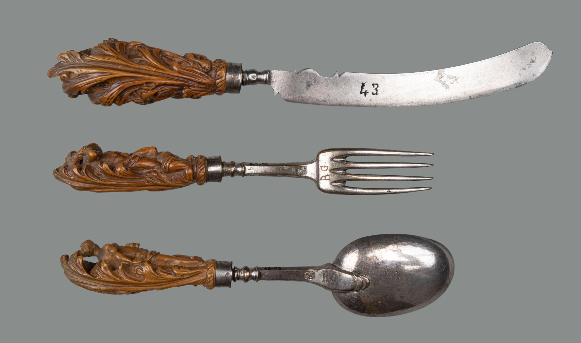 On the fork, Hercules striking at a man (Cacus ?) on the ground, with his club; On the spoon, two half-naked females holding respectively, a sheaf of corn and a bunch of flowers (probably Persephone and Demeter, or could be Ceres and Flora).Collection