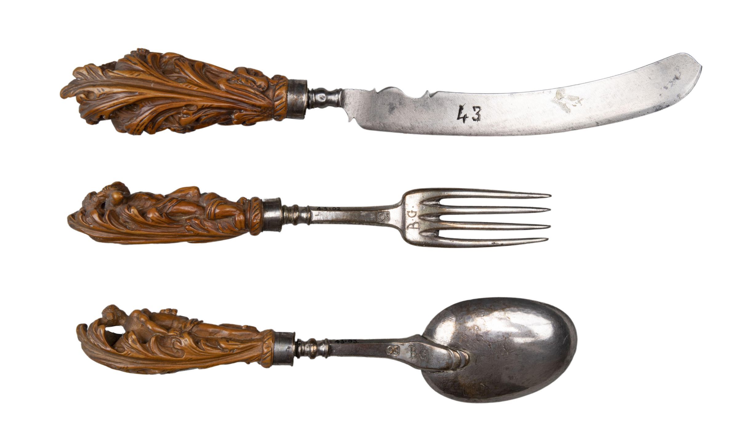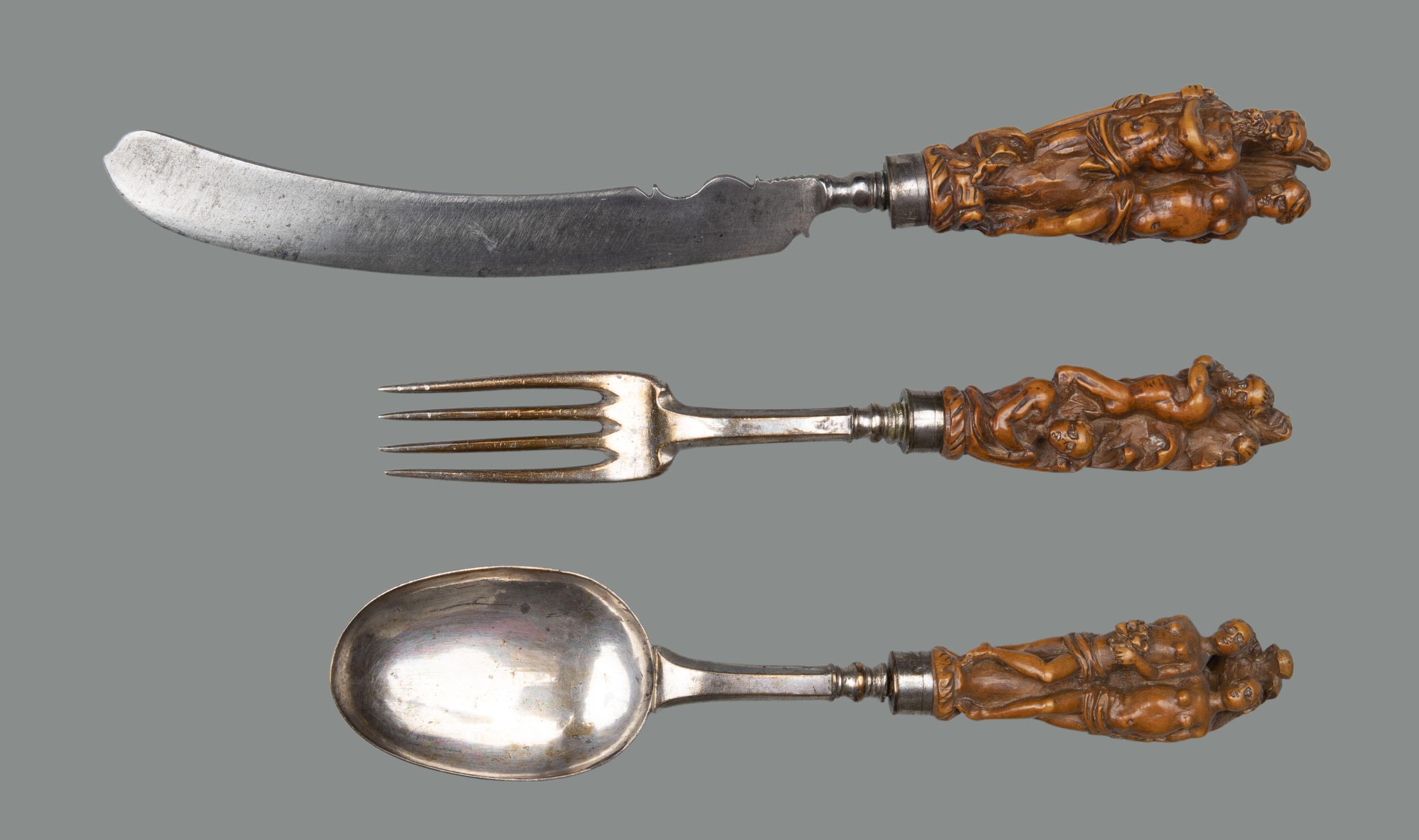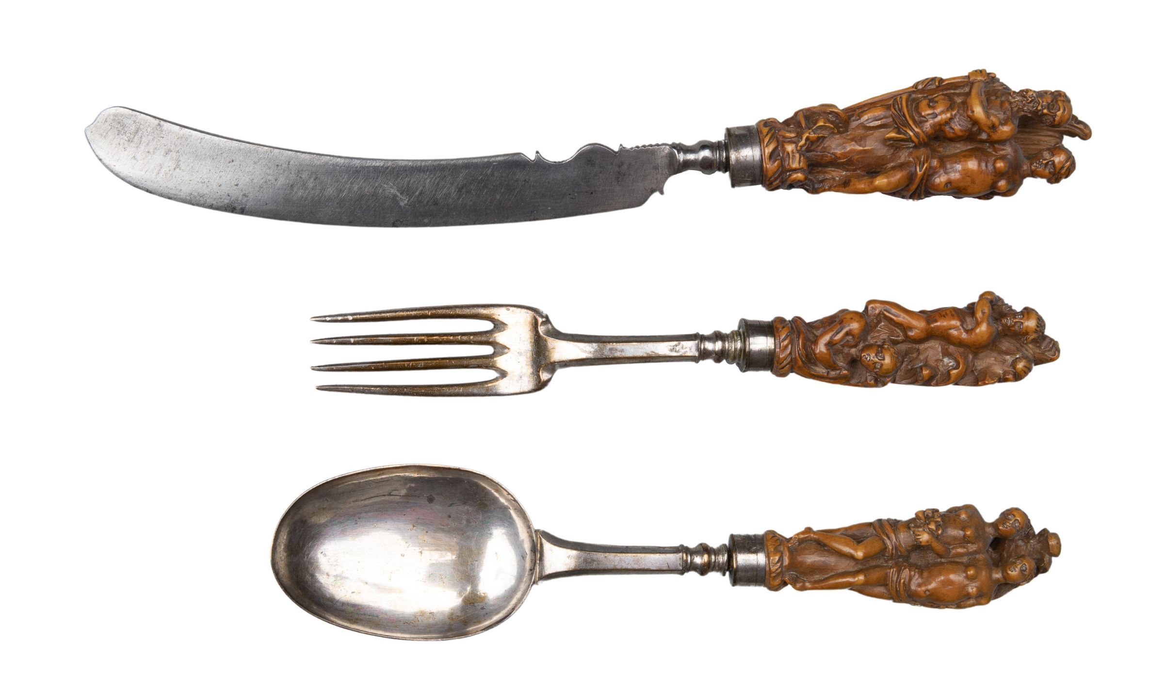 Handles: Boxwood, slightly tapering, with silver panels engraved with lines; each carved with a pair of classical figures in the round, backed by a large acanthus leaf:
