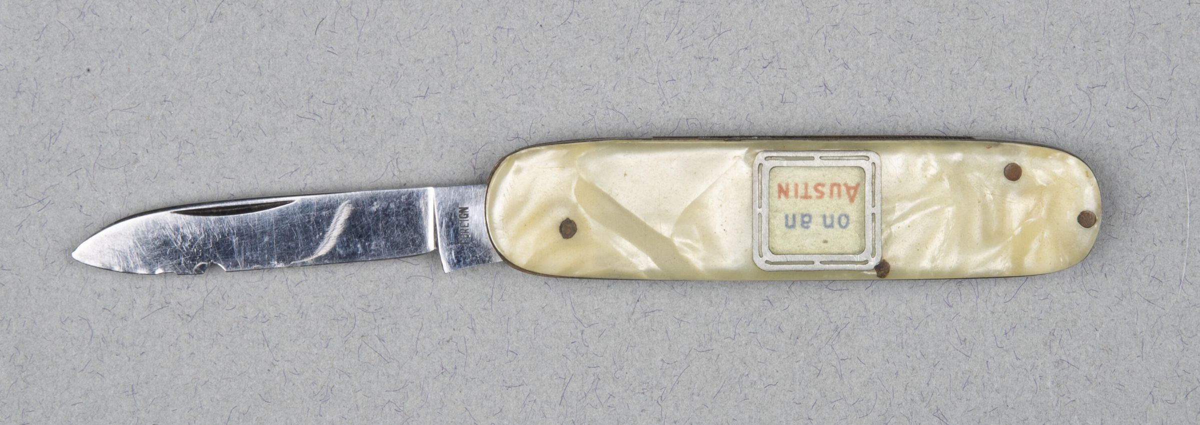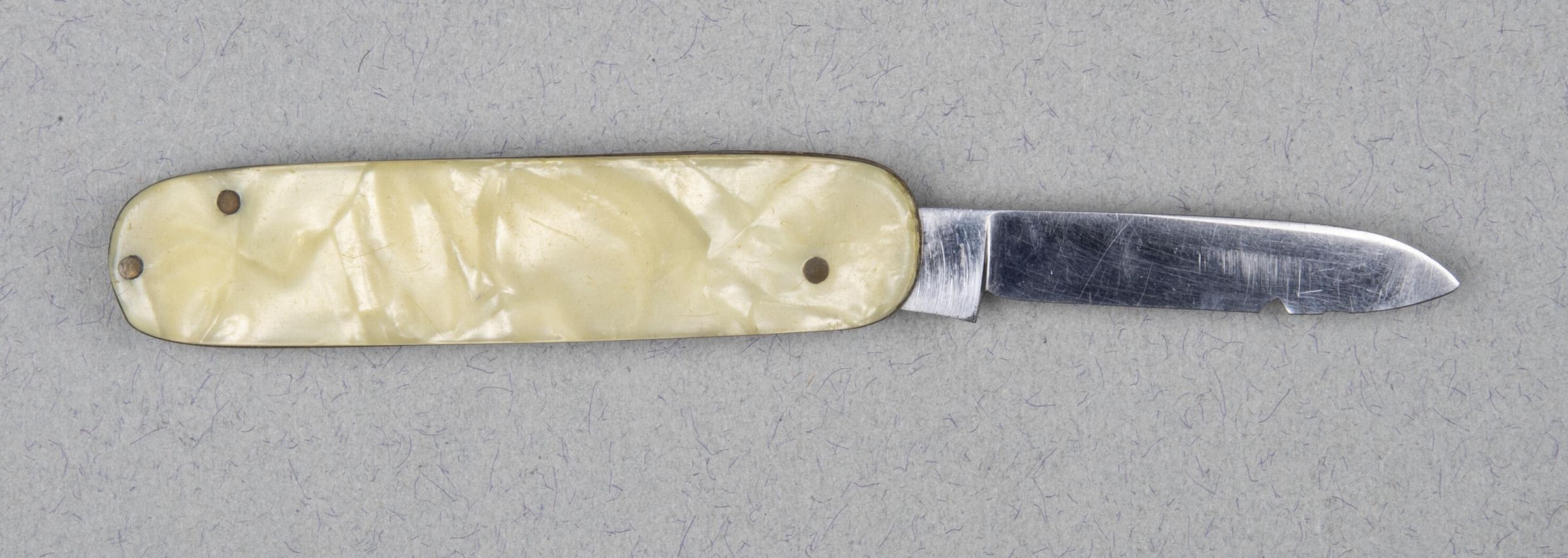 Single blade and match striker on back edge. Imitation mother-of-pearl scales with glazed window through which can be read \"you can/depend\Collection