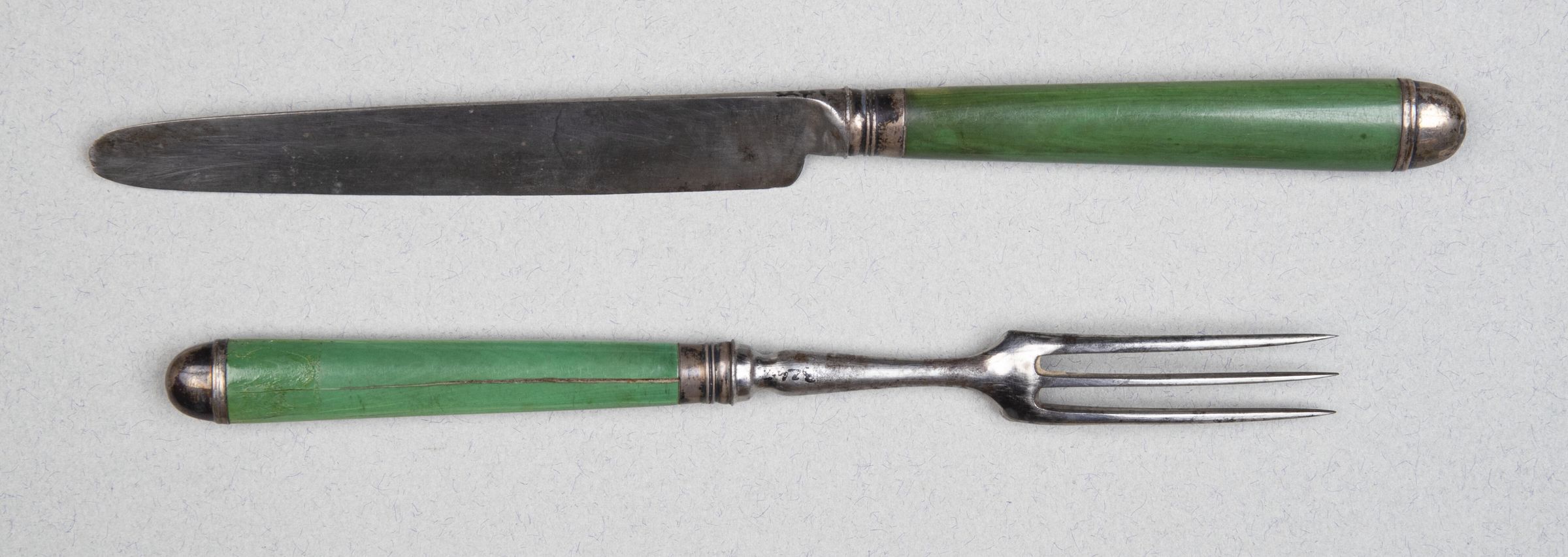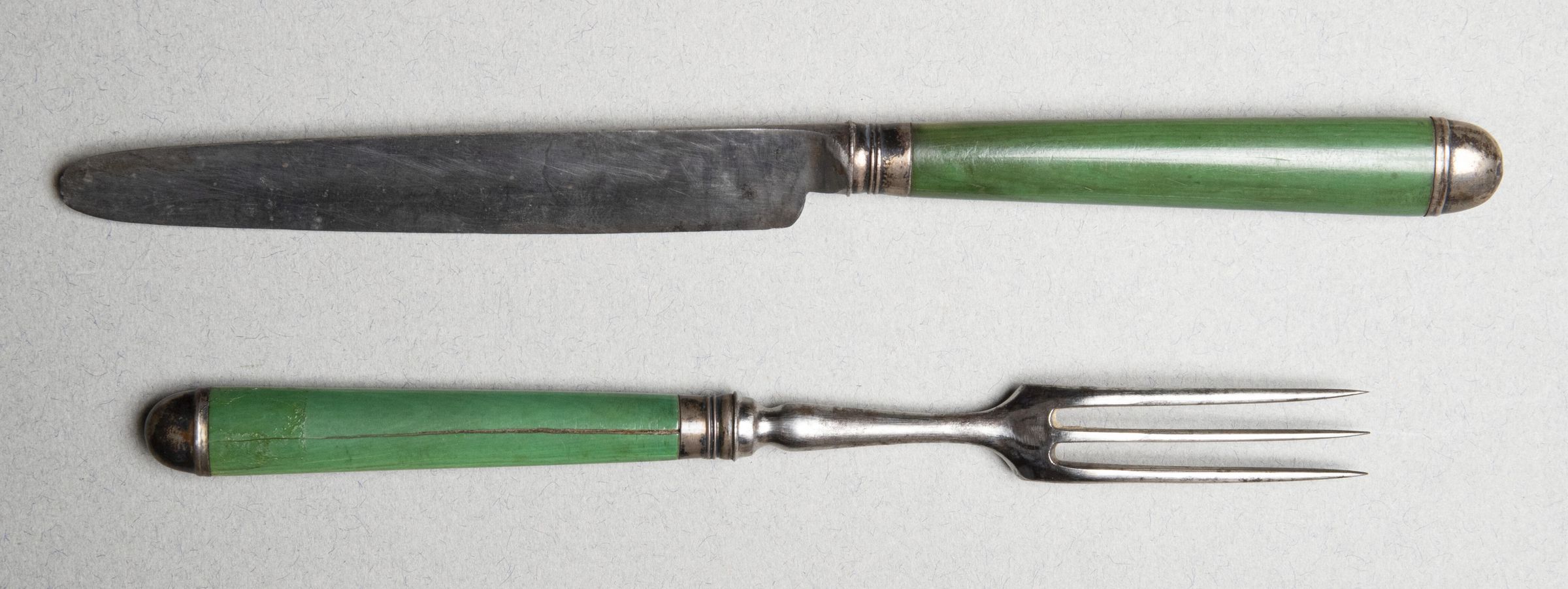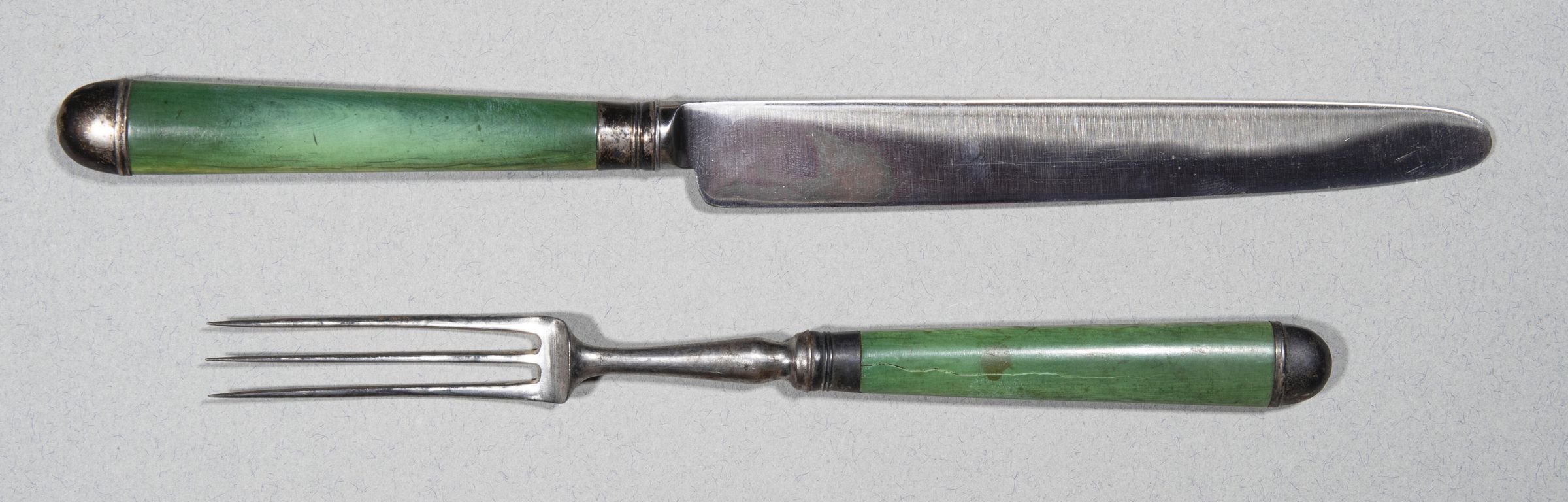 324.05 to 324.09 Forks: Heads with three curved tines and long baluster necks. Handles of green-stained bone, slightly tapering and of flattened oval section, fitted with silver ferrules and caps, the latter domed, and both with simple raised mouldings.Collection