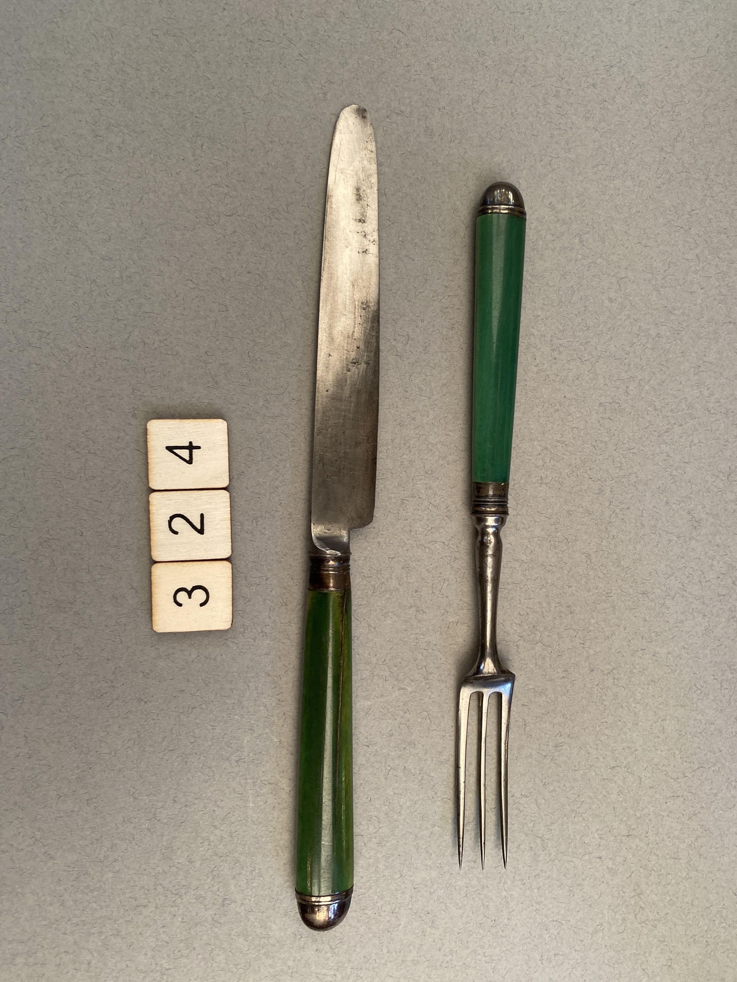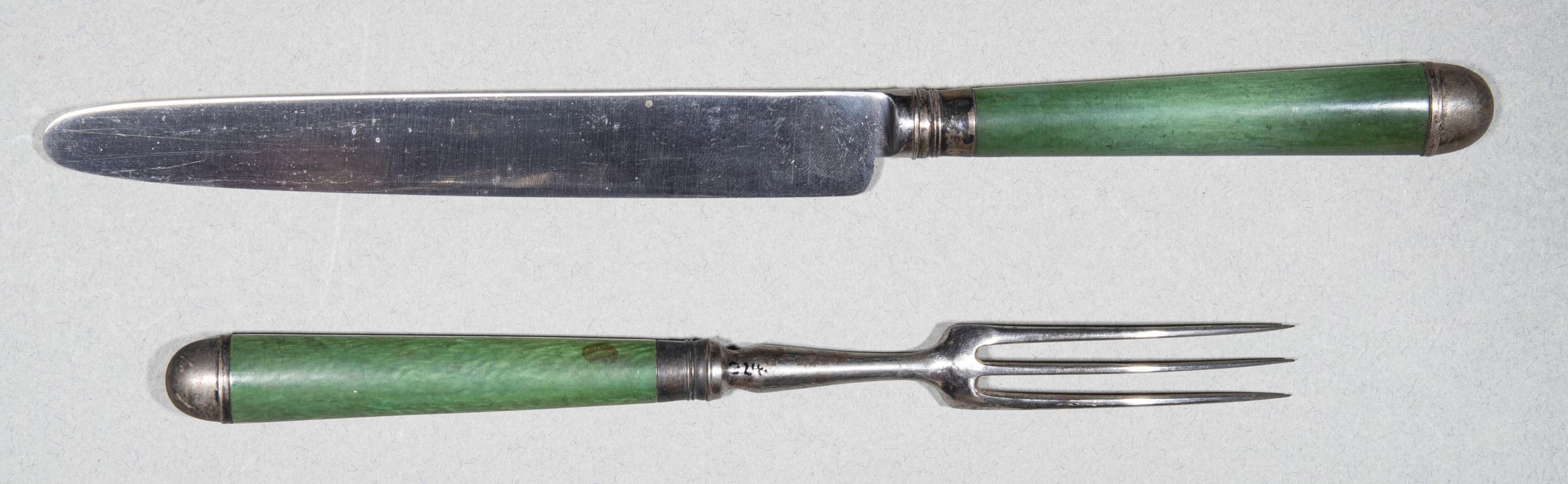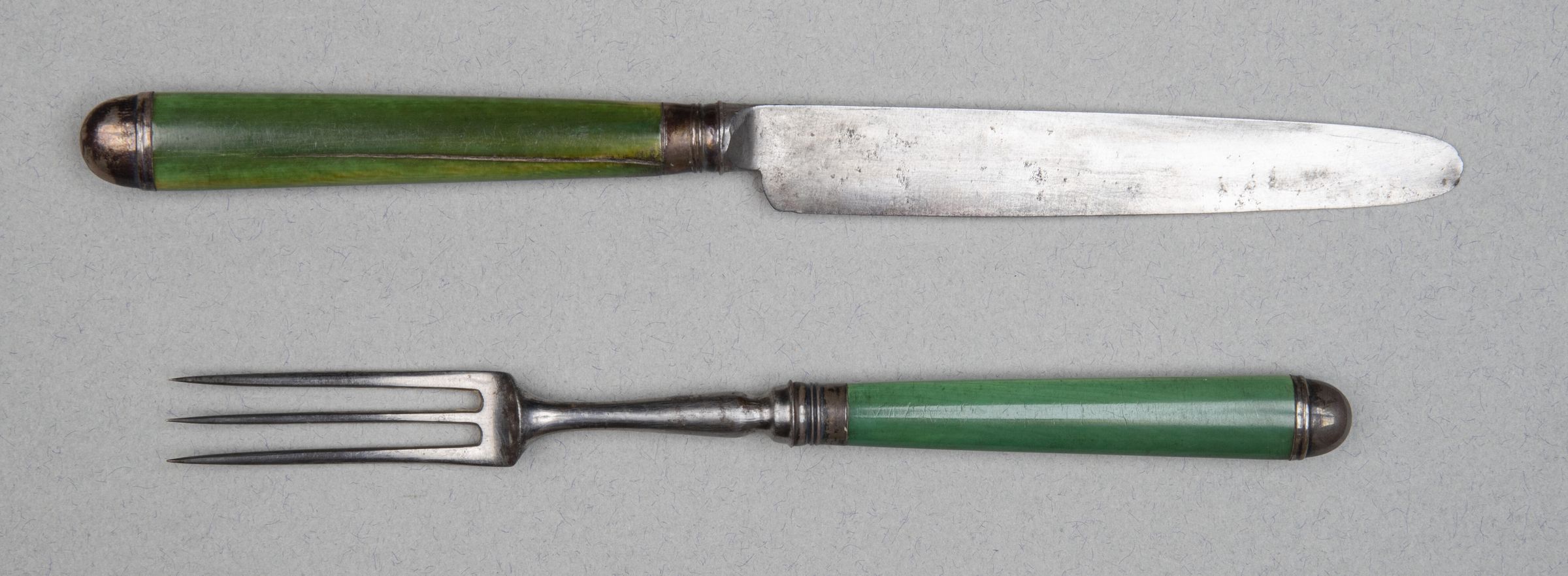 324.05 to 324.09 Forks: Heads with three curved tines and long baluster necks. Handles of green-stained bone, slightly tapering and of flattened oval section, fitted with silver ferrules and caps, the latter domed, and both with simple raised mouldings.Collection