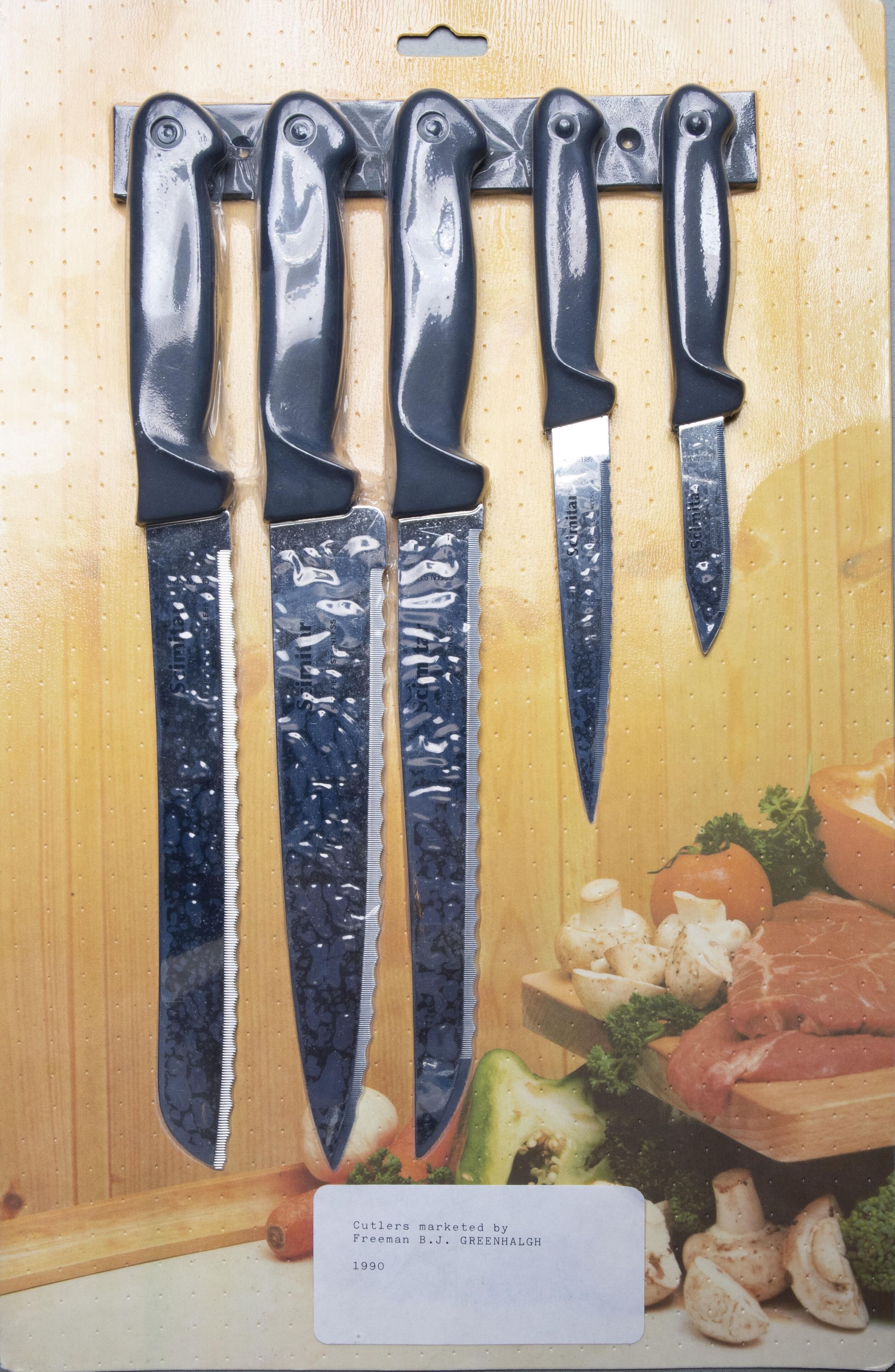 Set of five knives with black plastic moulded handles and a black plastic hanging rack. Mounted (shrink wrapped) on a display card.