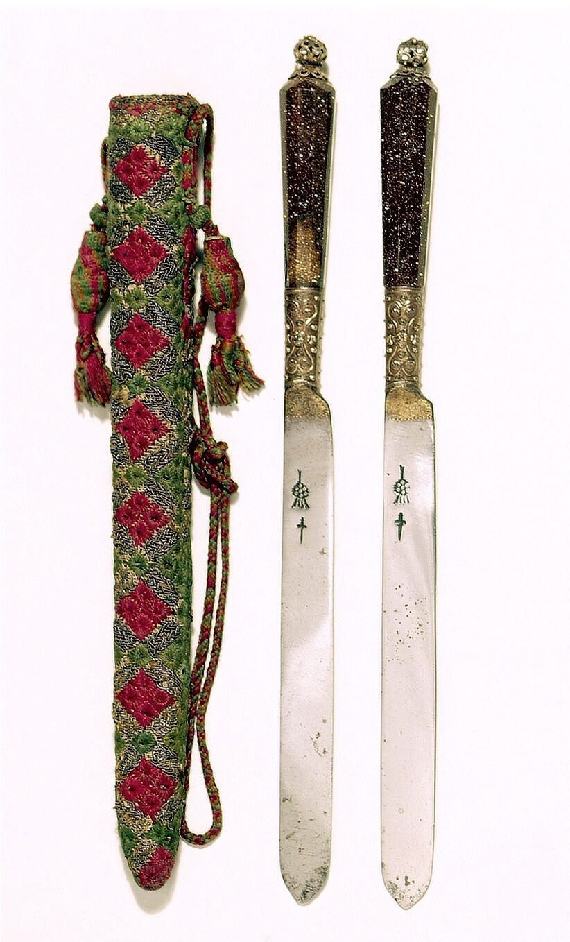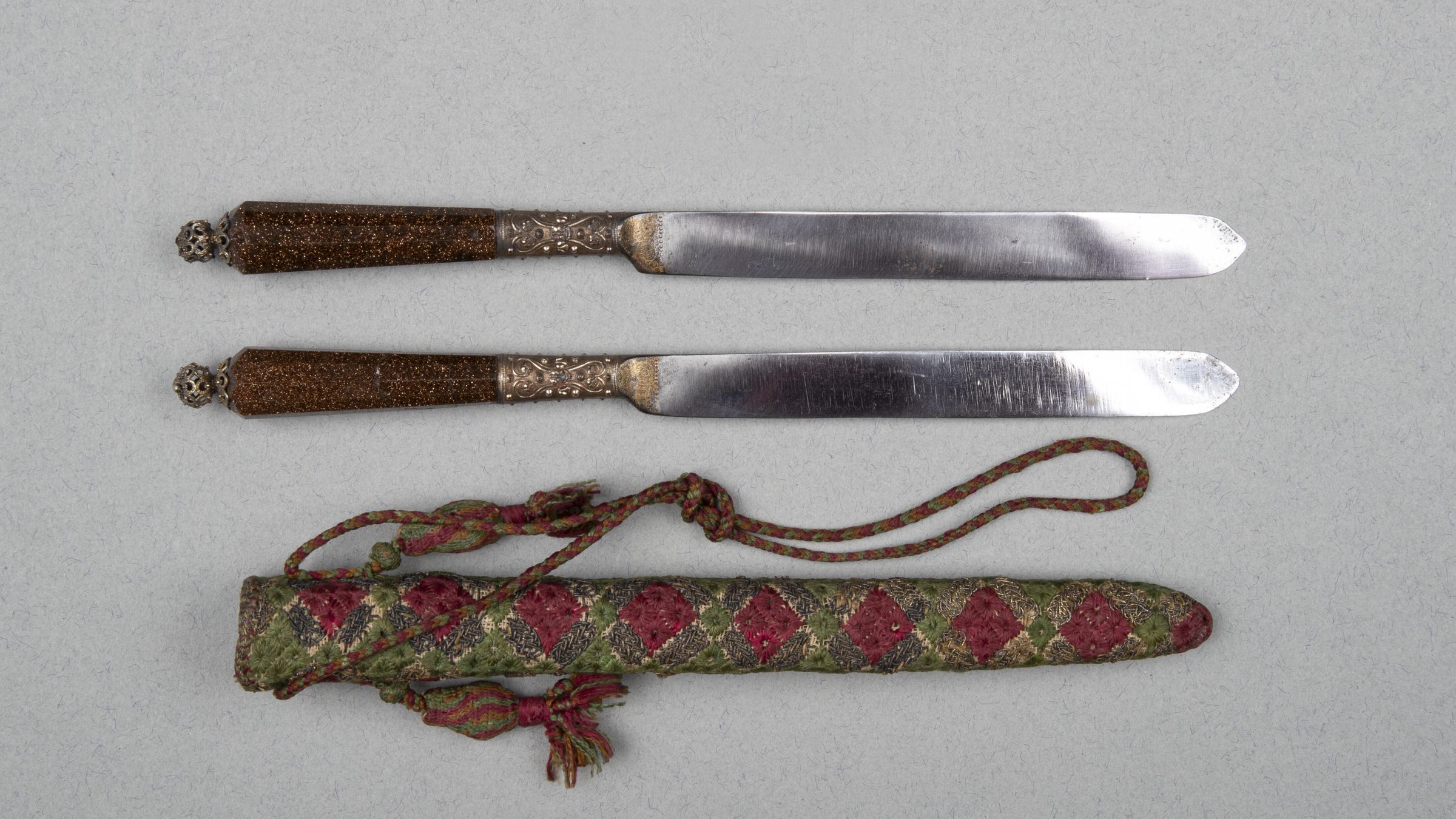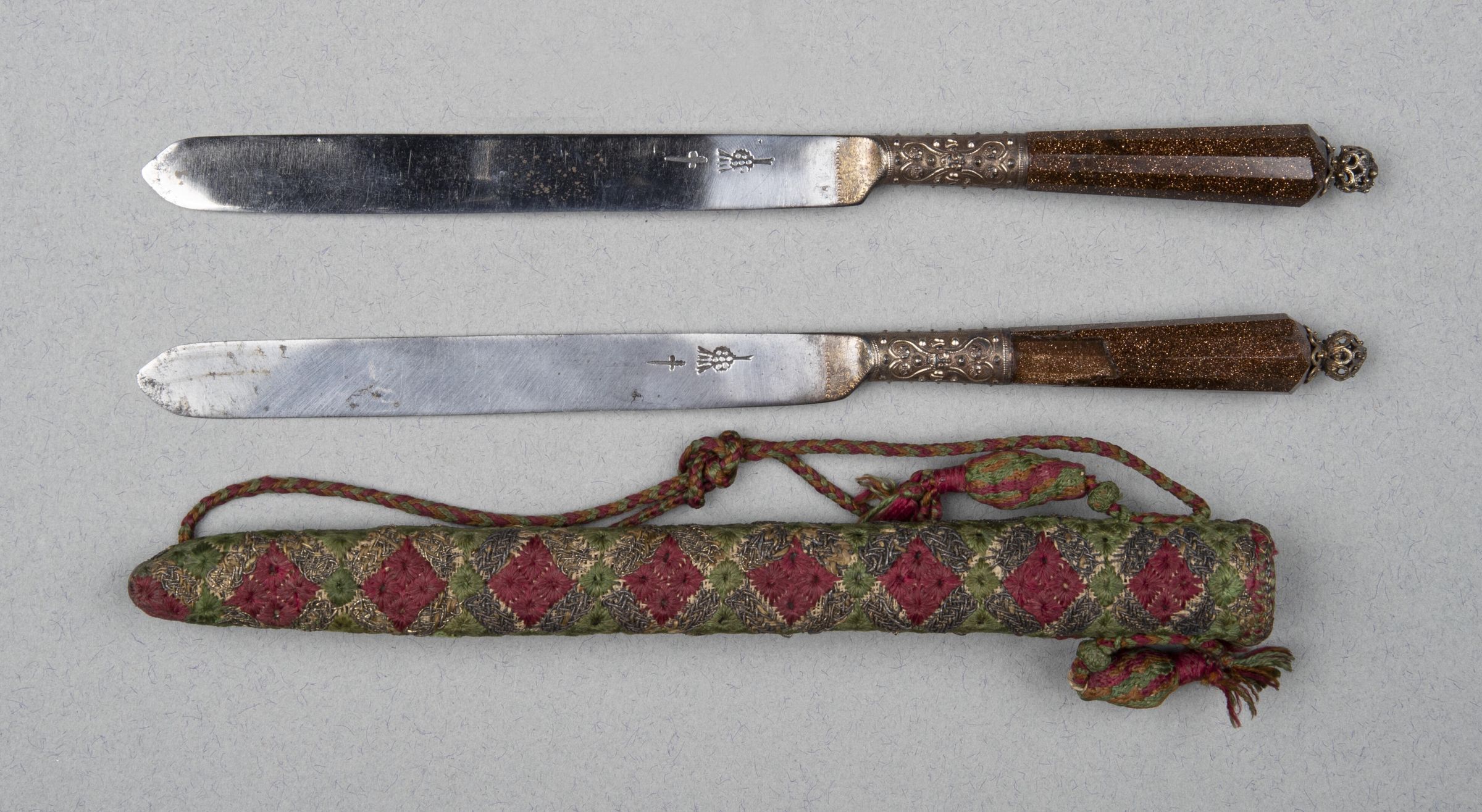 142.01 and 142.02 Knives: The blades with straight sides and leaf-shaped point. The hollow bolsters gilt and etched. The long bolsters gilt and encrusted with silver ornament. The flaring handles of aventurine glass, with rounded off ends and silver-gilt filigree finials.