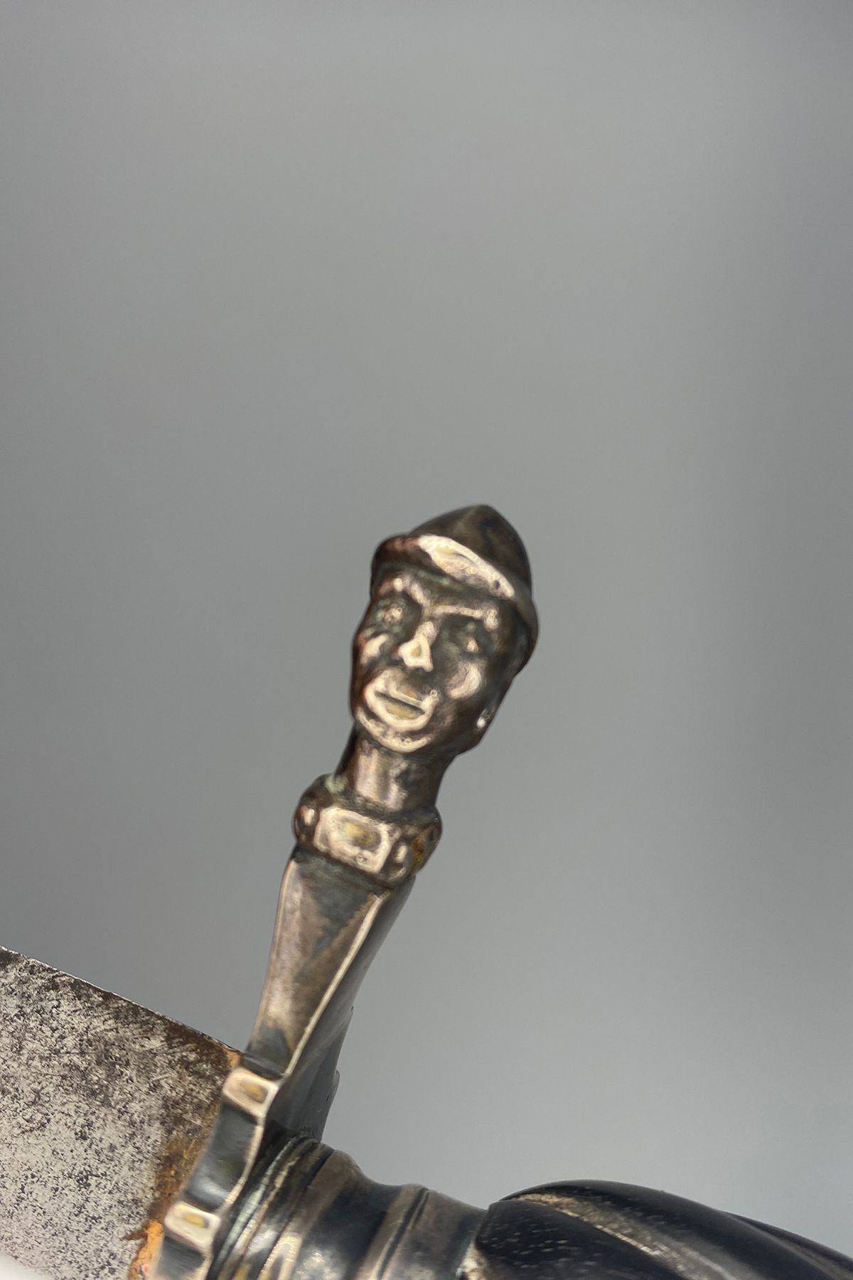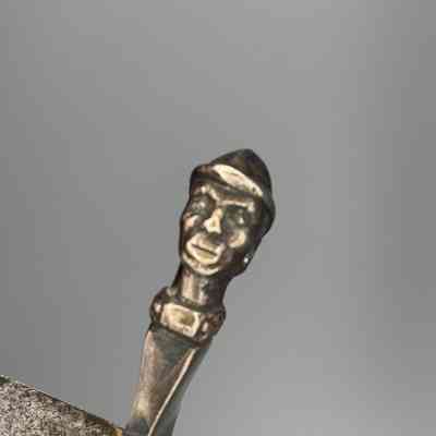 The identical relief head motif appears on other late 17th-century English plug bayonets with silver mounts in museum collections. A well-documented example is illustrated in the Colonial Williamsburg Foundation’s online catalogue: an English silver-mounted plug bayonet with three helmeted heads on hilt fittings, dated to ca. 1690, London (hilt fittings by William Knight, blade by John Hathaway) — viewable here: