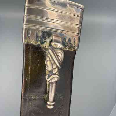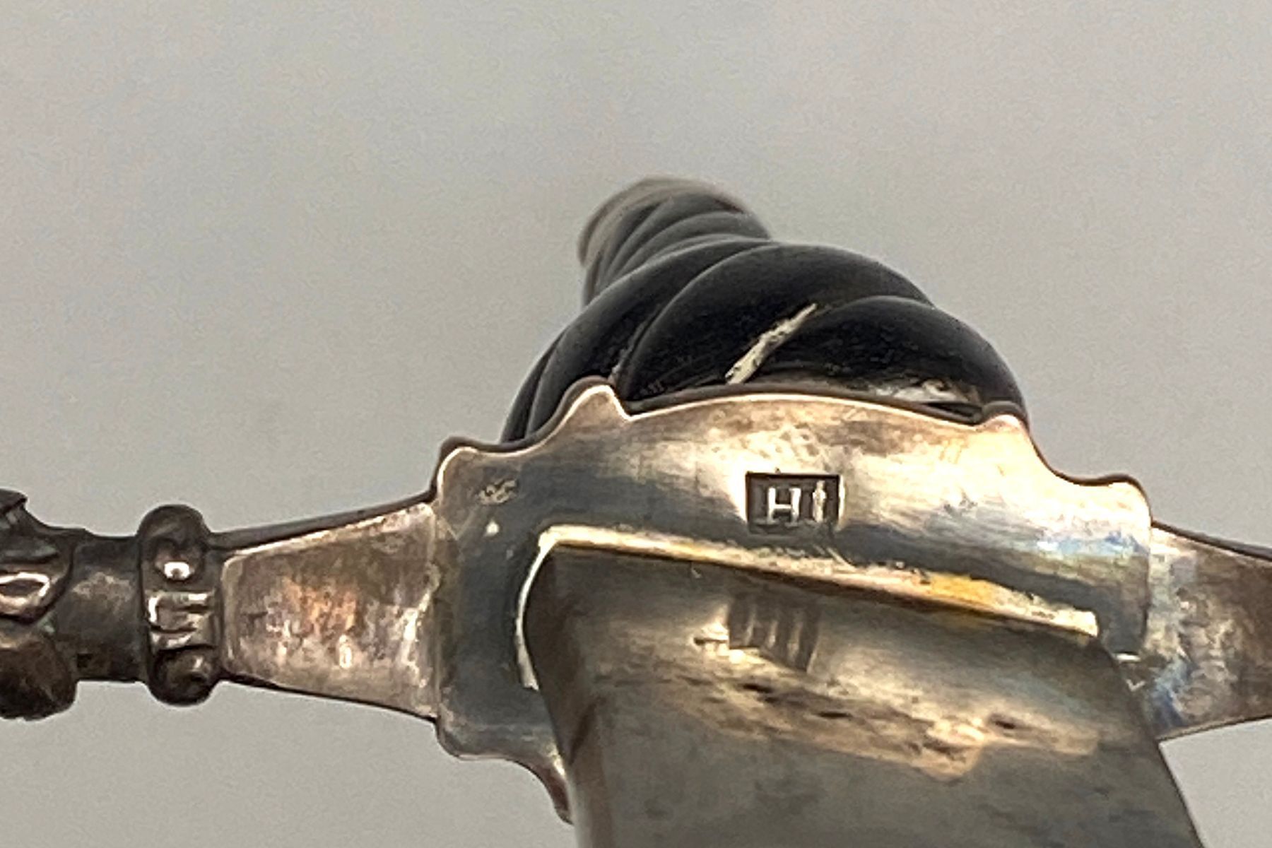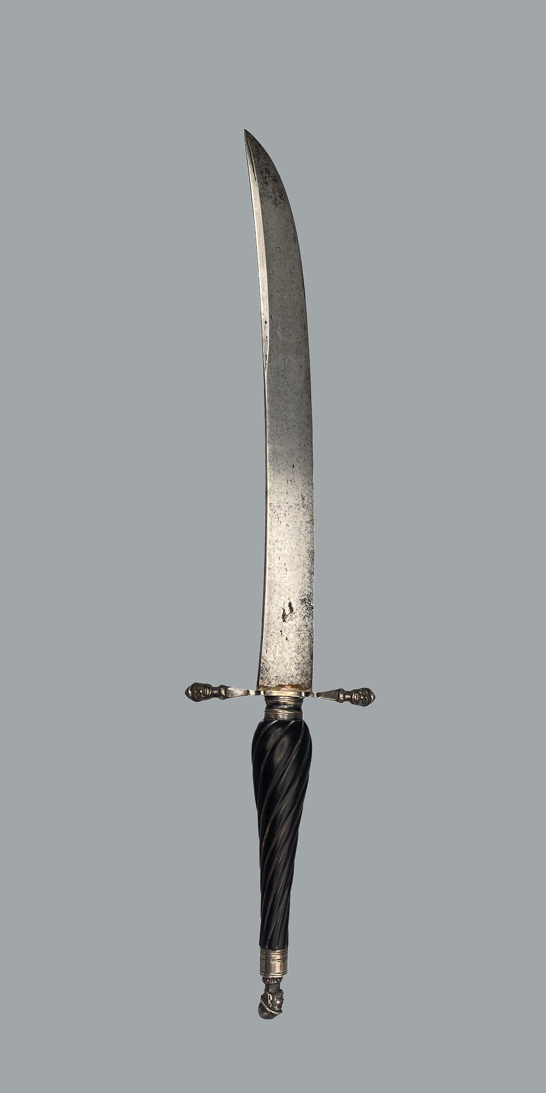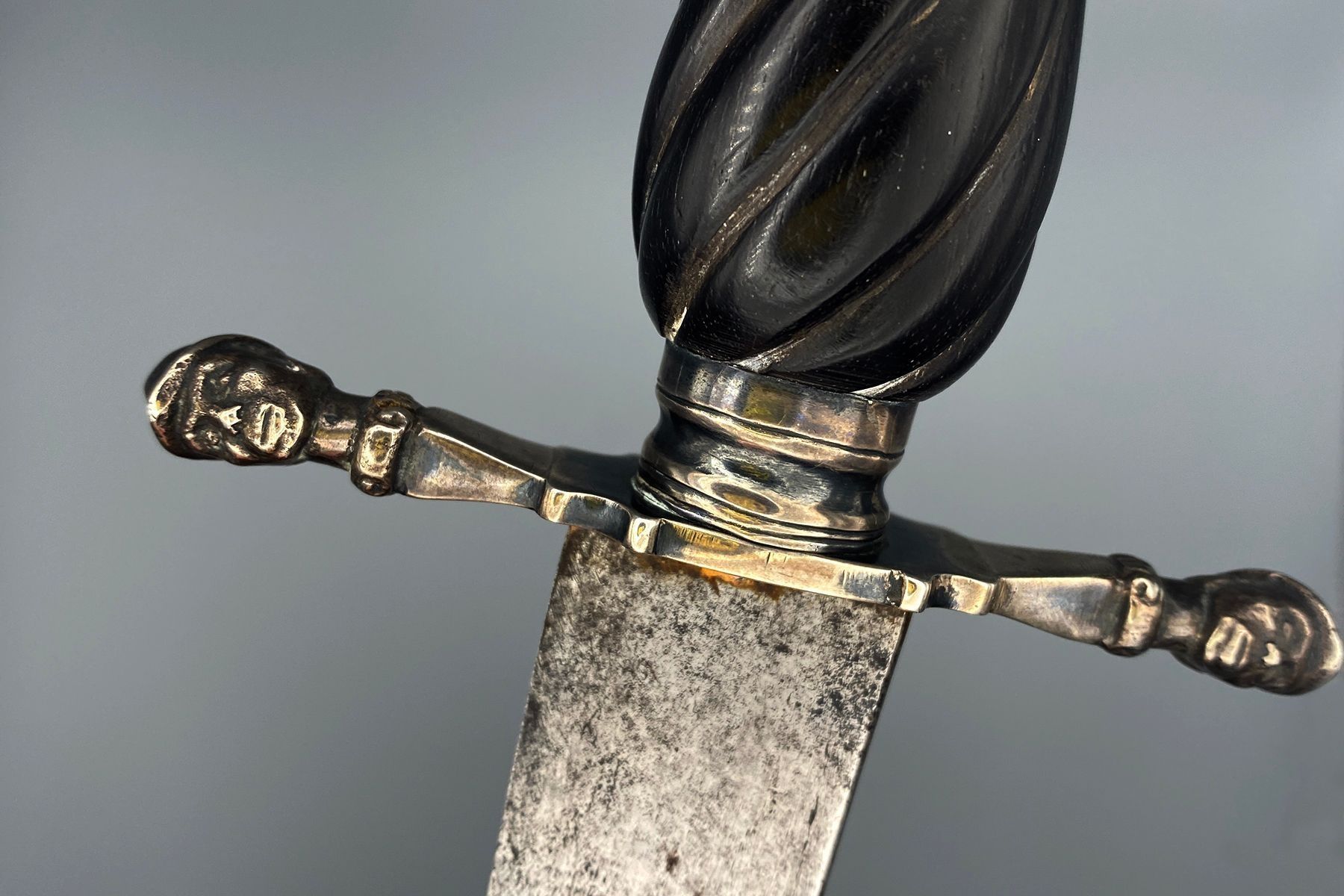 A luxury English plug bayonet with a straight steel blade, finely turned spiral grip of dark hardwood, and elaborately worked silver hilt. The guard and pommel terminals are each cast with relief heads, executed in a restrained late Stuart idiom. The silver furniture bears a maker’s punch reading “HI / IH,” consistent with London craftsmanship of the early 18th century. The bayonet is accompanied by its original tooled leather scabbard, the upper mount of which replicates the same relief head motif found on the hilt, demonstrating that hilt and scabbard were conceived and executed as a unified commission rather than later assembled.