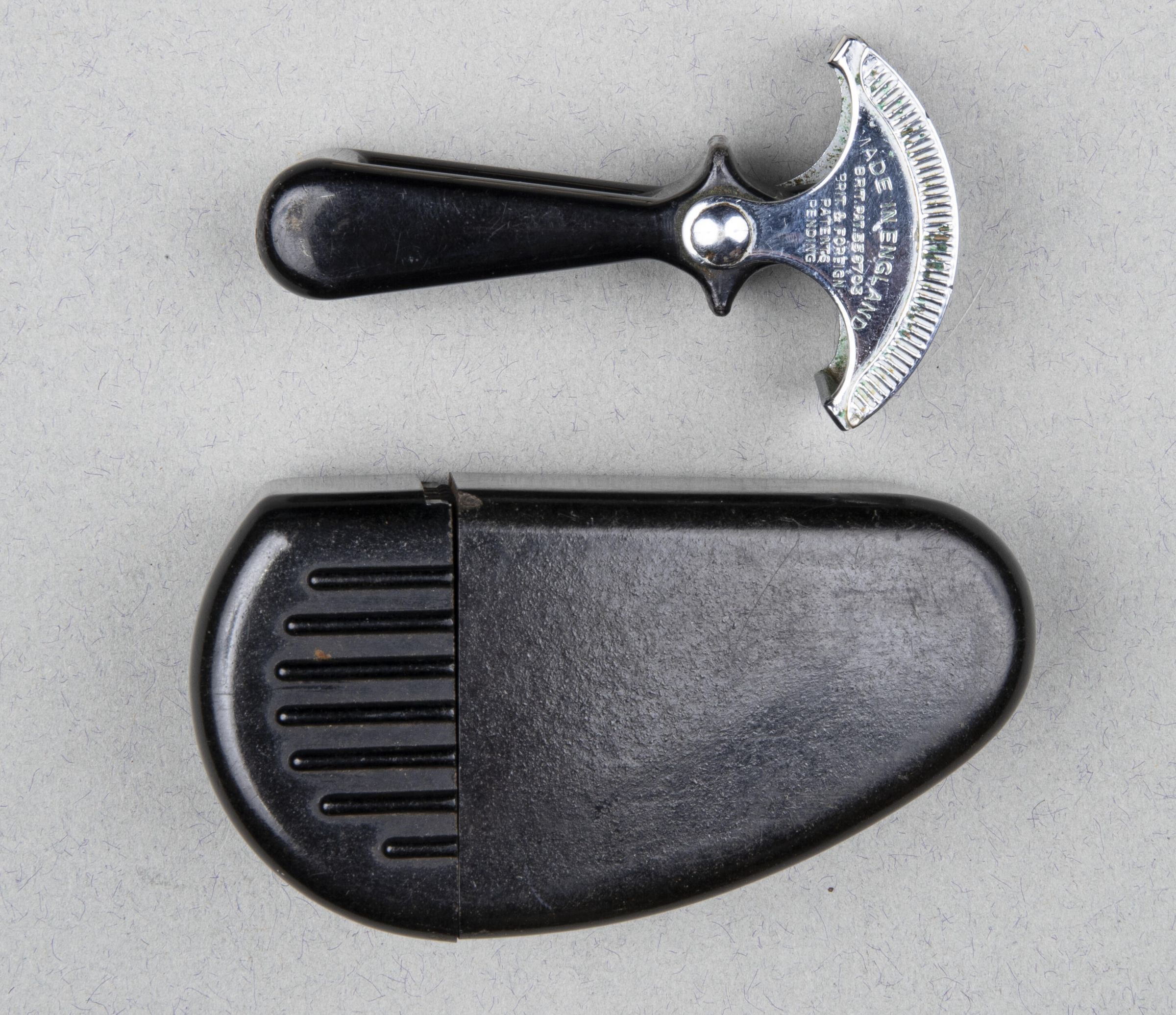 The integral handle is of black bakelite and pivots on bearings placed about halfway along its length, so that cutting blades are swept across the sheet of gauze in a semi-rotary action.