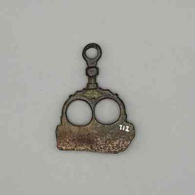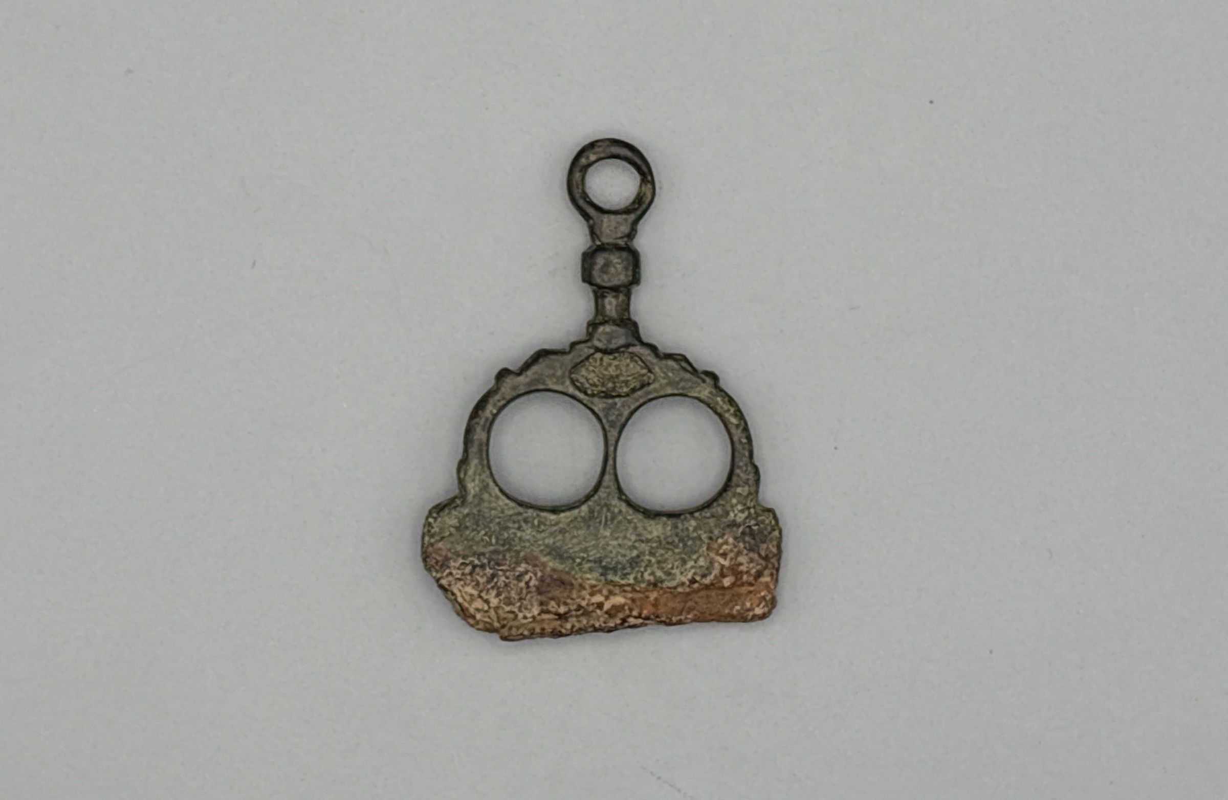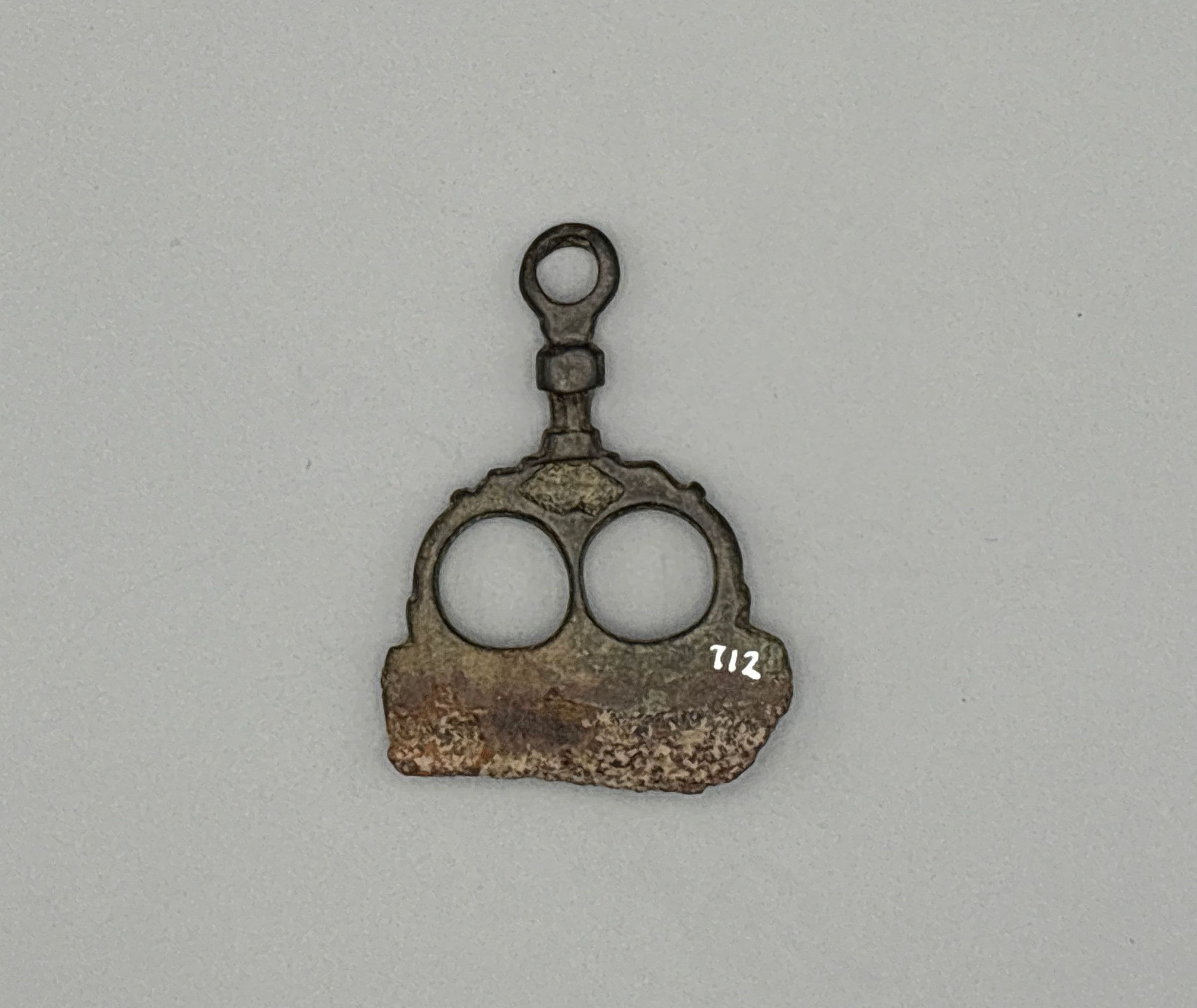 Roman: Corroded blade, 2 circular finger holes; sockets for embellishments; small hook for hanging at end of neck. Cu alloy handle; remnants of Fe alloy bladeCollection