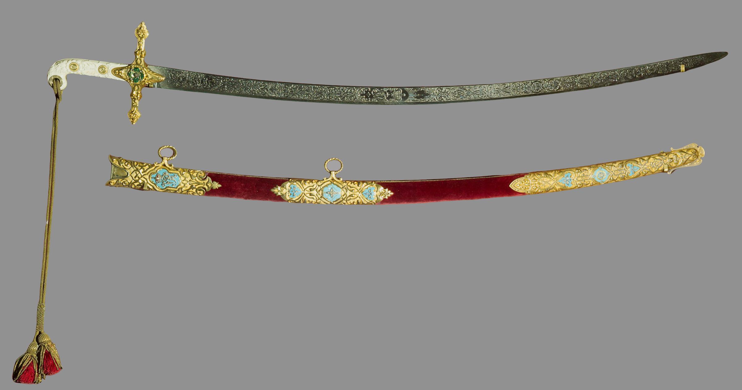 Presented by H.M. Queen Victoria to H.H. Maharaja Krishnaraja Wodeyar III of Mysore in 1861, with etched blade, the mameluke hilt with green-enamelled flowerhead set with diamond and ivory-grips carved with foliage, in its original velvet-covered scabbard, the mounts set with diamonds against light blue enamel groundsCollection