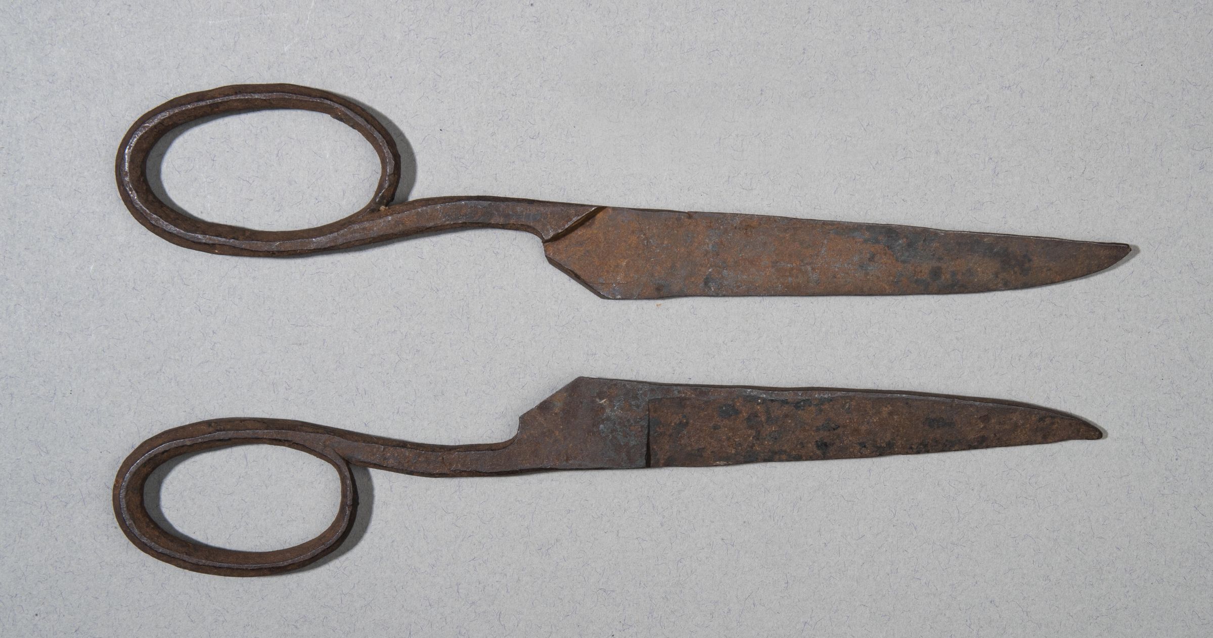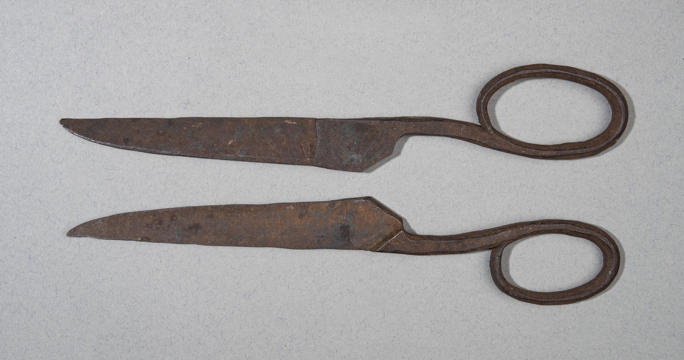 355.01 and 355.02 Two forgings of tailoring scissors of iron, corroded.
