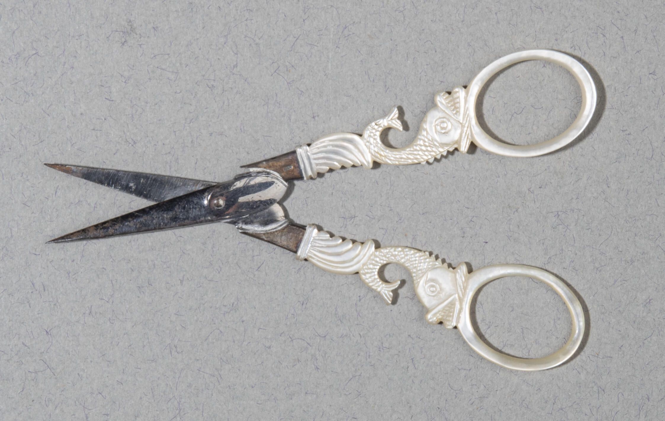 Needlework scissors with painted steel blades. Mother of pearl handles carved as dolphins; the finger rings of the handles overlap when closed.Collection