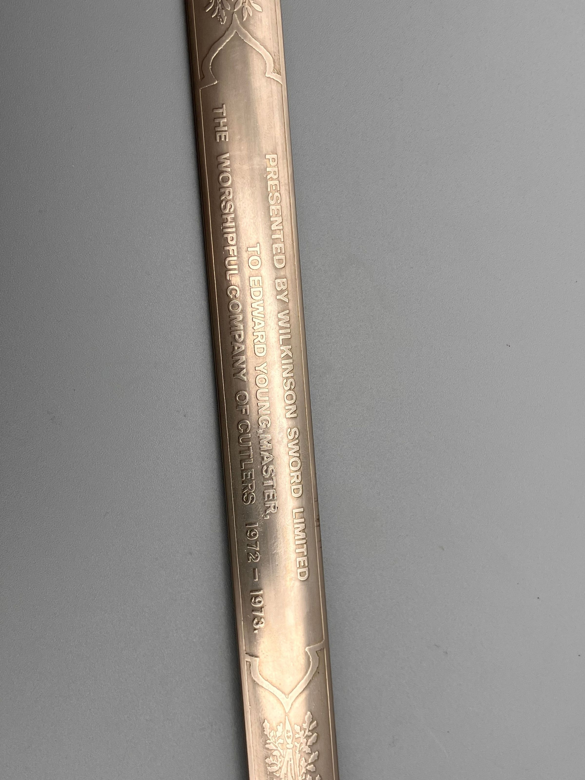 On blade: the arms of the Cutlers Company and PRESENTED BY WILKINSON SWORD LTD. TO EDWARD YOUNG. MASTER, THE WORSHIPFUL COMPANY OF CUTLERS 1972-1973Other Names and Numbers