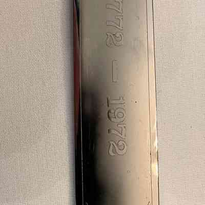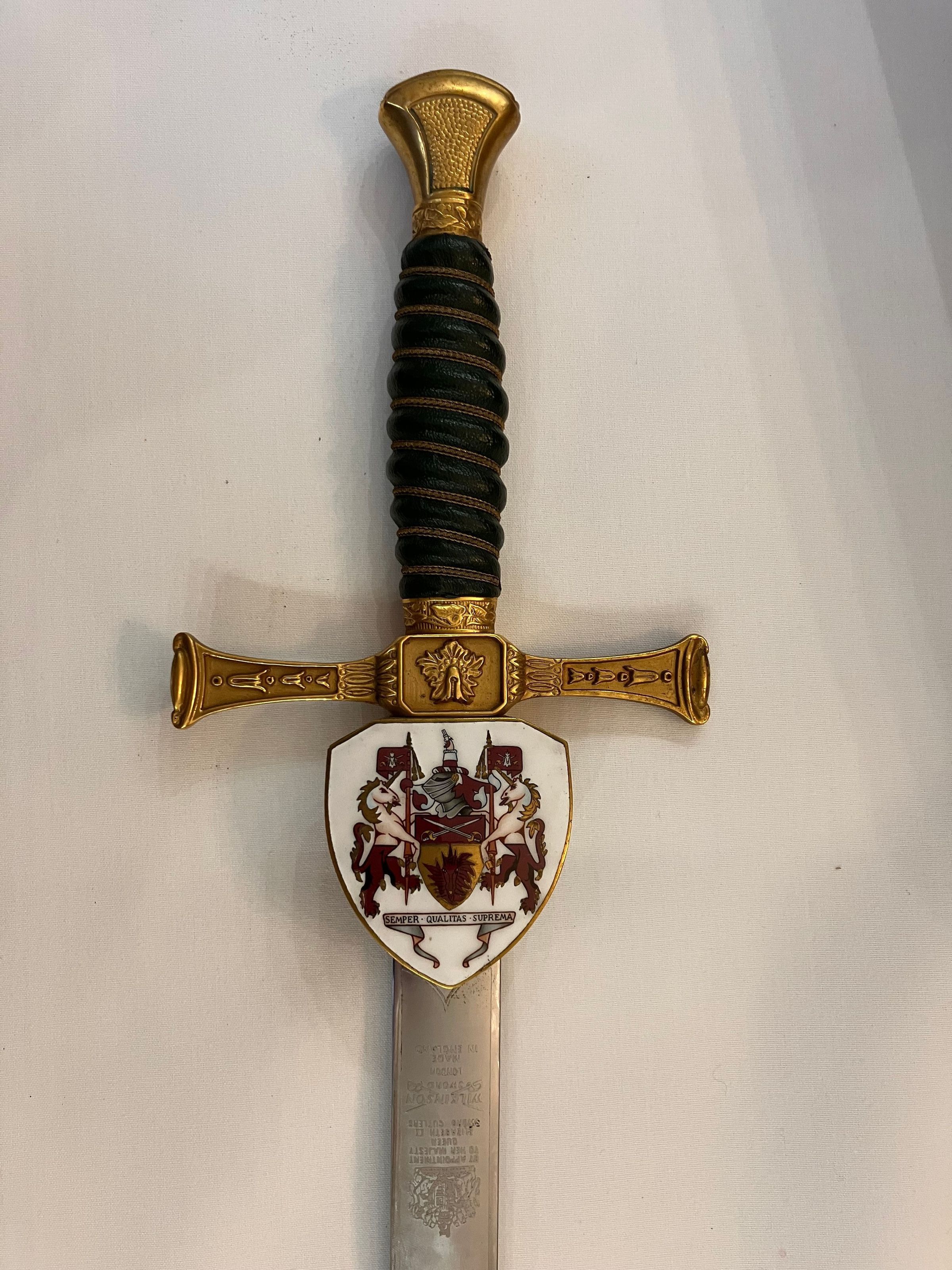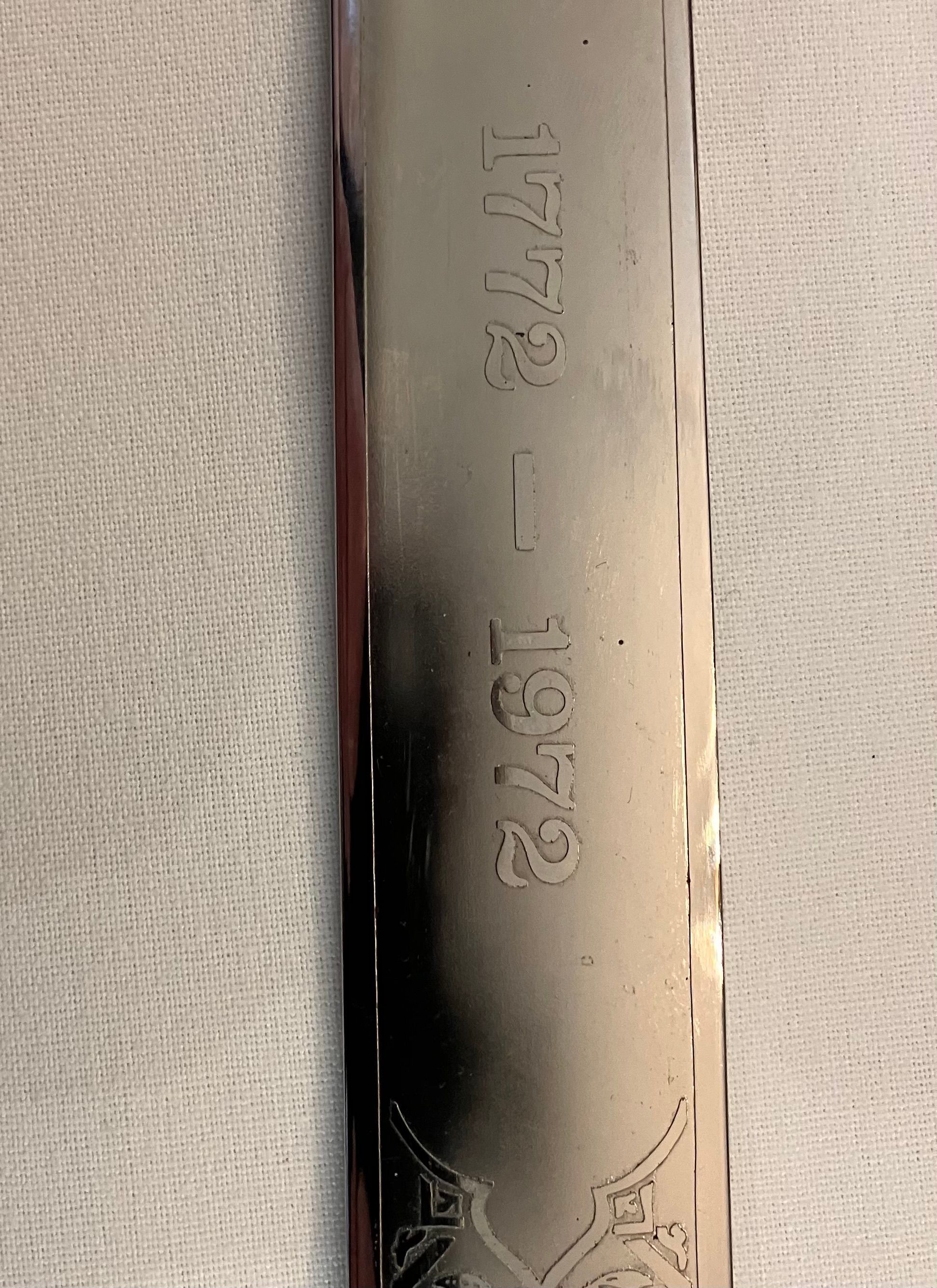 On front of blade: Royal arms, BY APPOINTMENT / TO HER MAJESTY / QUEEN / ELIZABETH II / SWORD CUTLERS, logo of Wilkinson Sword, LONDON / MADE / IN ENGLAND. and, further down the blade, 1772-1972