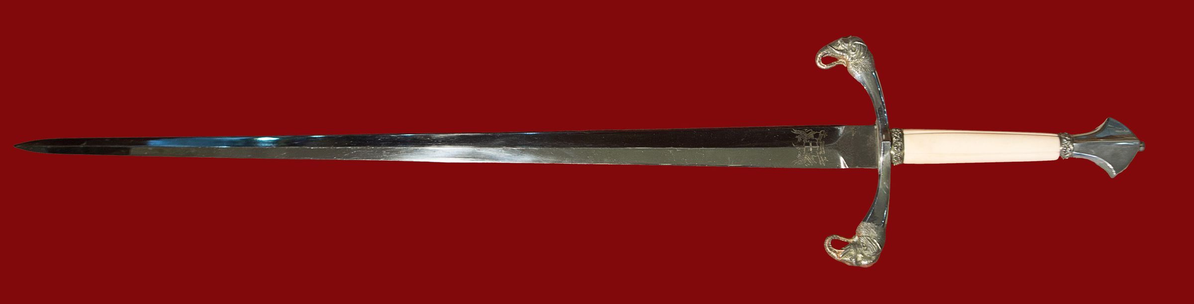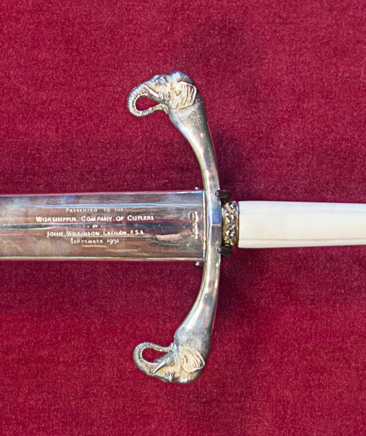 493.01 Sword: Blade of double-edged diamond section. Blade etched with arms of the City of London on one side and arms of the Cutlers Company on the other. Hilt and scabbard mounts of silver, silver-gilt and grip of ivory. Gilded elephant head finials to guards. Two gilded bands decorated with leaves above and below ivory grip.