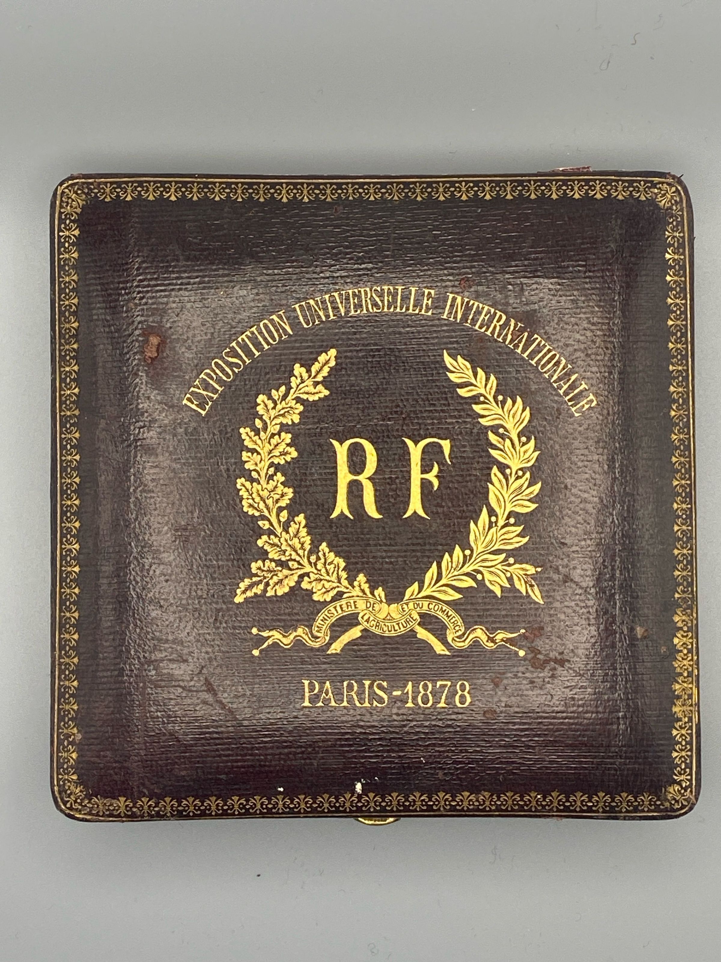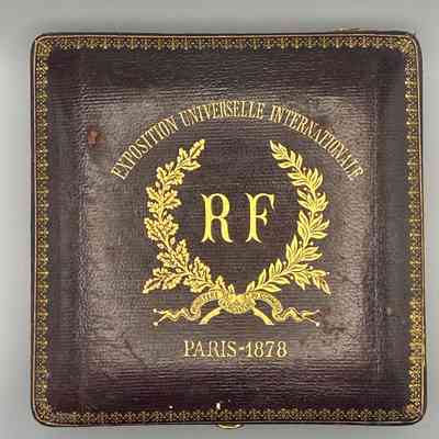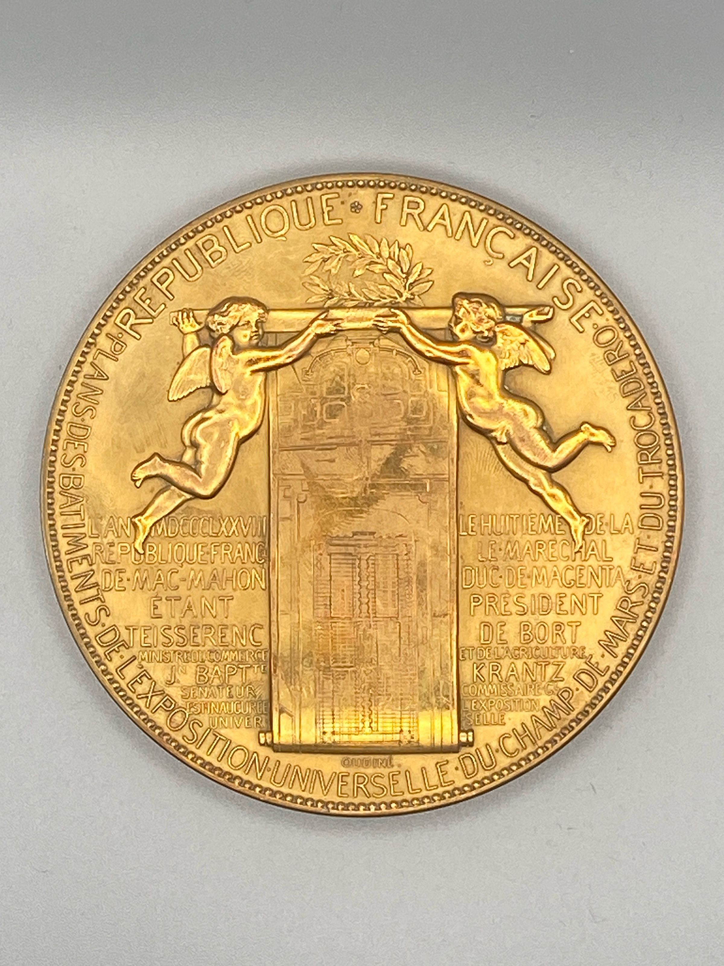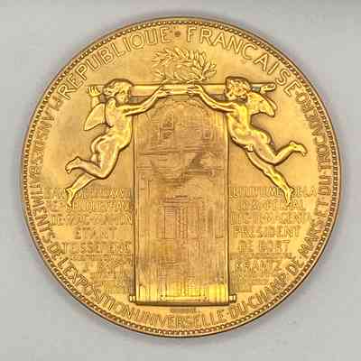 The central figure on the obverse with the star on her head and a wreath in each hand seems to represent the notion of prize-giving. From left to right are figures of Industry, Commerce , Science , and the Arts. Below are two boys, one holding a branch and the other wheat and a scythe. In the background is a view of the exhibition and below a reclining river goddess (the Seine) and a shield bearing the arms of Paris. See text for further explanation.