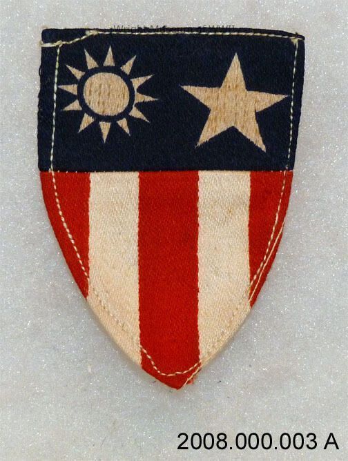 Patch, U.S. Army, unit affiliation, China-Burma-India Theater. A Shield shaped patch made of two pieces of printed cotton sewn togther, the top piece is blue, with a white sun to the left and a white