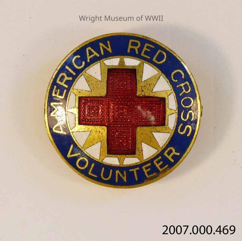 U.S. Red Cross volunteer pin. Brass round domed pin featuring the red cross on a gold star with a white background. Around the rim a band of dark blue with the words "American Red Cross Volunteer" in gold. On the reverse the number "F-5514P." Pin back.Update Date