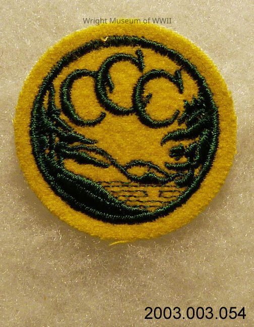 Patch, U.S. Civilian, Civilian Conservation Corps. On a yellow felt backing a dark green embroidered forest and lake scene, with the letters "CCC" across the top, all enclosed in a dark green embroidered border.Update Date