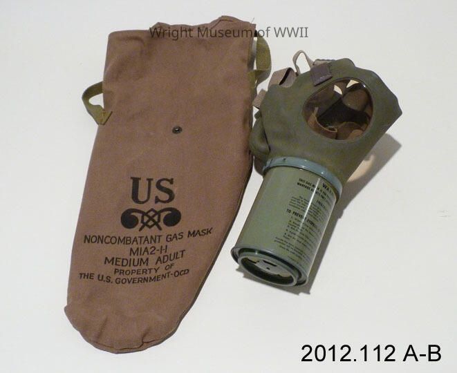 A) Gas, mask; Non-Combatant, M1A2-1-1. Civilian gas mask with attached canister. Olive drab colored rubber mask, plastic eye lenses with orange tone, khaki colored canvas straps with metal hardware. Instructions printed in black on canister. Appears unused.