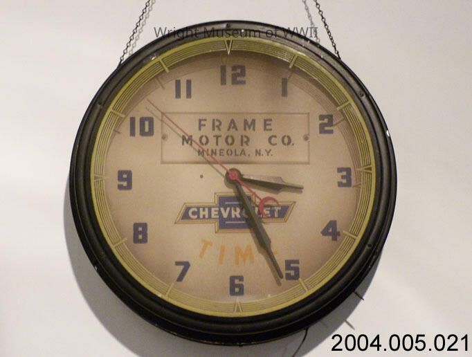 Wall clock "Frame Motor Company". Black metal frame. White face with black numbering, glass covering with decorative painted yellow border. Black and white painted metal sign screwed to face of clock: "FRAME / MOTOR CO. / MINEOLA, N.Y." Clock face painted with "CHEVROLET" logo. "TIME" painted in yellow at bottom of face. Black chain for hanging the clock on wall. Plug-in electrical cord still attached.Update Date