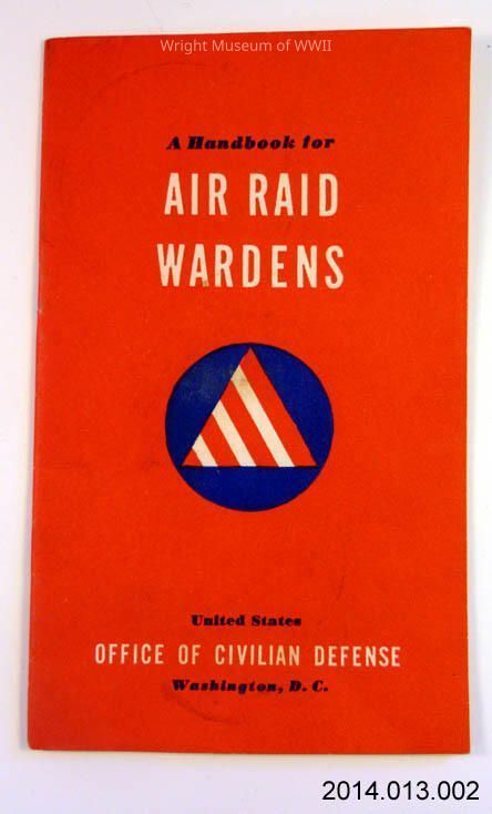 Booklet, Instruction, U.S., Air Raid Wardens. A small booklet entitled "A Handbook for Air Raid Wardens". Published by United States Office of Civilian Defense, September 1941, Washington D.C. Booklet cover is red, with the CD Air Raid Warden insignia on the front. Writing in both black and white. 25 pages.Update Date