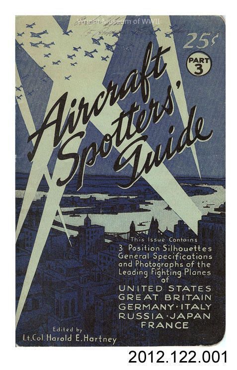 Book, "Aircraft Spotter's Guide, Part 3". Softcover. Blue and black printed covers. "25 cents" at upper right. 96 pages of black and white text, photographic images, and illustrations. Shows "Leading Fighting Planes of United States, Great Britain, Germany, Italy, Russia, Japan, and France". Bound with staples.Update Date