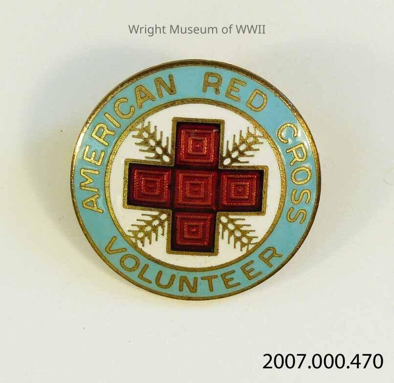 Pin, U.S., Red Cross volunteer. Brass round domed pin featuring the red cross on crossed thistles with a white background. Around the rim a band of light blue with the words "American Red Cross Volunteer" in gold. Pin back.Update Date