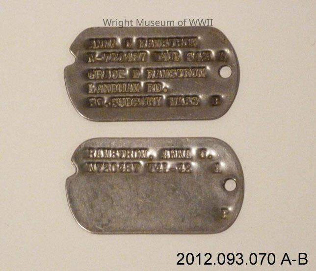 Pair of metal dog tags for Anna Ramstrom, Army Nurse Corps. Each has a notch at upper left and a hole for stringing at right.