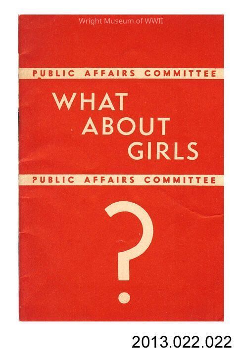 Booklet: "What About Girls?", a Public Affairs Committee pamphlet. This is a pocket-sized booklet with red and white printed cardstock covers. Written by Eliot Ness, Division of Social Protection, Office of Community War Services, Federal Security Agency. Provided by the Army and Navy Department of the Young Men's Christian Associations. Prepared as a guide for Navy personnel and dated 1945 on last page. 31 pages. Black and white text and cartoons. Bound with staples. Book warns the reader about the dangers of veneral disease, prostitution, etc.Update Date