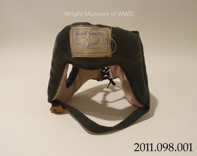 US Army (Special Services) boxing helmet. Black leather exterior, cream colored leather interor. Helmet is stuffed with soft material (to absorb blows). Fits onto top of head with cutout spaces for ears. Laces at back of helmet (cotton lacing) and cotton strapping goes below the chin and across the top of the head. Two identical identification stamps, barely legible (one on the maker's label and the other is on the interior of helmet). "W[ ] SSO" possibly, Special Services. Leather stamped at back of head as well: "8 / SPECIAL SERVICES / US ARMY".Update Date
