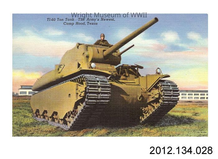Postcard, featuring a black and white photograph with added color enhancements. Shows a tank at Camp Hood, Texas. "TI-60 TONE TANK - THE ARMY'S NEWEST / CAMP HOOD, TEXAS" caption printed in black across top. Postcard is unused (blank on reverse). Collected by Robert Hoisel while training at Camp Hood, around 1944.Update Date