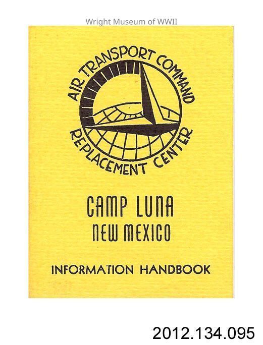 Pocket-sized handbook or booklet: "CAMP LUNA / NEW MEXICO" "INFORMATION HANDBOOK" printed in blue on yellow covers (printed cardstock covers). "AIR TRANSPORT COMMAND REPLACEMENT CENTER" logo printed above. 24 pages. Black print on white paper. Map of base, history of camp, information about recreation, etc. inside. Belonged to Robert Wanger, who served there in 1944.Update Date