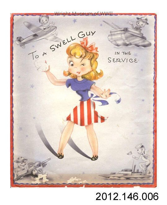 Greeting card, with color printed illustration on front: "To a Swell Guy in the Service", showing a cartoon girl in red, white, and blue clothing, winking. Inside, there is a slotted space to insert a photographic print. Printed greeting at left: "Hope this little photo will sort of take your eye and please you....". Handwritten signature "Bella" in black ink at lower right. Maker information "Meryle / T-678 / USA" printed on reverse.Update Date