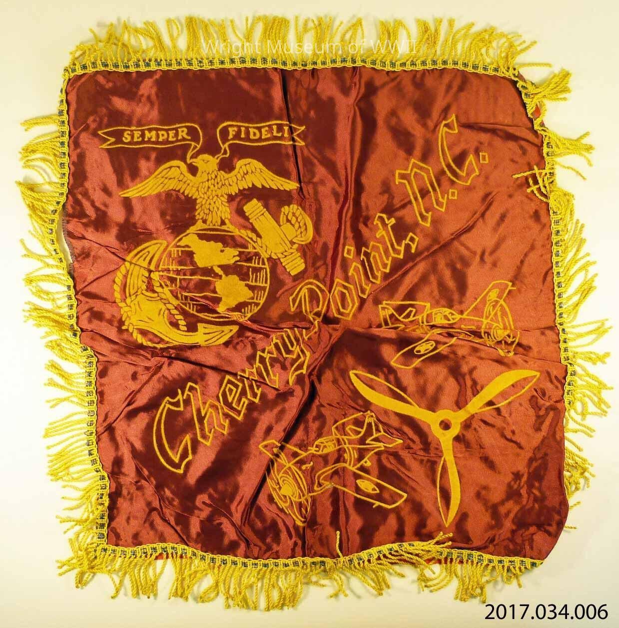 Cover, pillow, patriotic, USMC. A maroon and gold pillow cover from Cherry Point, NC, Marine Corps Air Station.