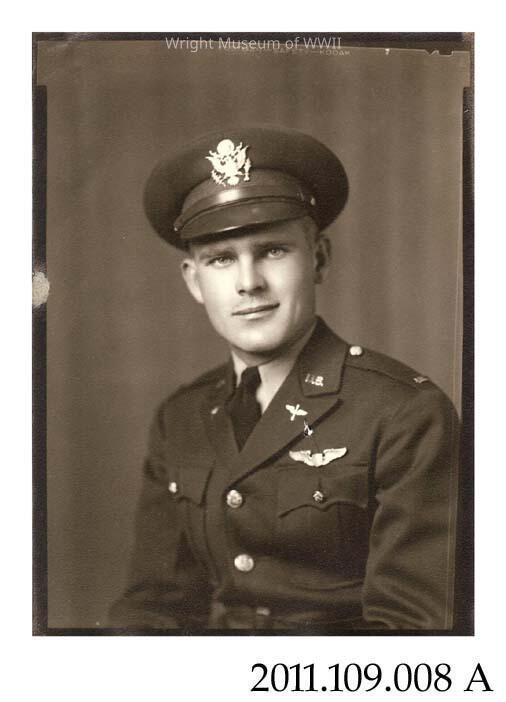 A) Black and white photograph portrait of Clayton Hale wearing US Army Air Corps service uniform (items 2011.109.001, .002, and .004). Shows Hale seated, from waist up. Wears his pilot wings above breast pocket on jacket.