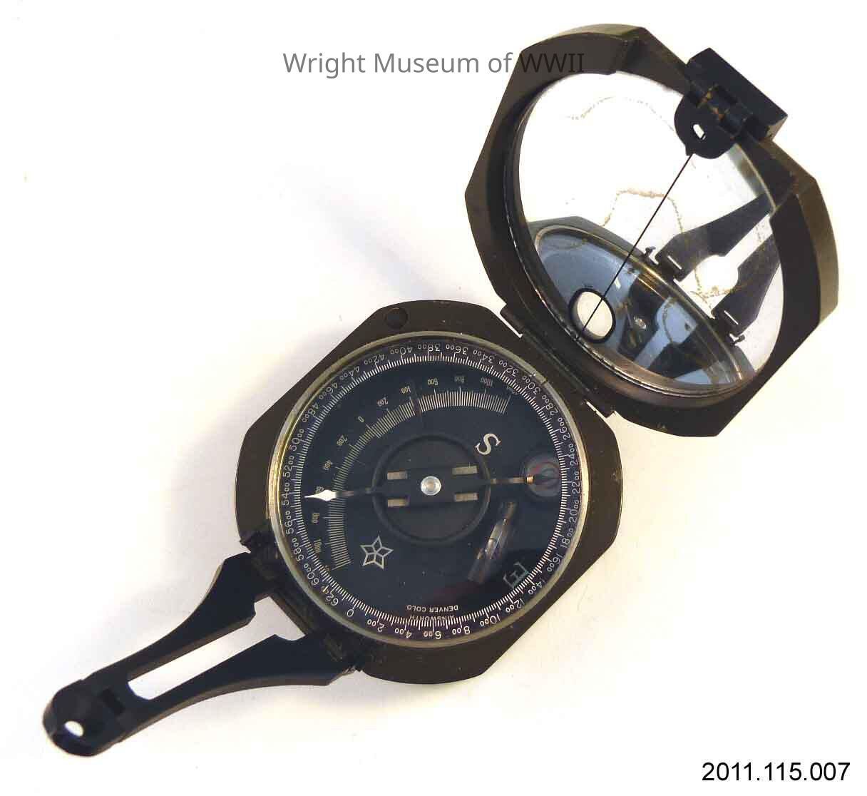 Equipment, personal, U.S., compass, M2. A very precise compass in an octagonal, olive drab case. Only markings are on the dial "Ainsworth" over "Denver, Colo." Used by artillery.Update Date