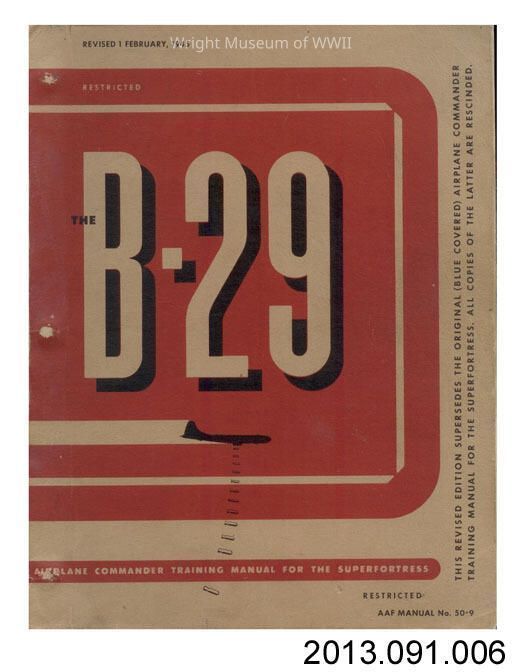 Book or manual: "The B-29; Airplane Commander Training Manual for the Superfortress". AAF Manual No. 50-9. Dated February 1945. Published by the Army Air Forces. Brown paper covers with black and red print on front. Bound with metal rivets. 224 pages. Includes content on training to be a B-29 pilot or airplane commander, also general information on personal equipment use and maintenance, first aid, bail-out procedures, etc. Color illustrations and black and white photographic images throughout.Update Date
