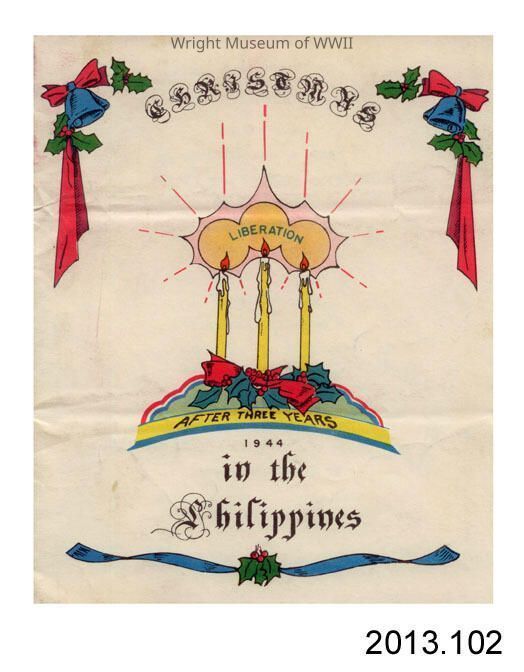 Menu and greeting card: "Christmas in the Philippines" "LIBERATION / AFTER THREE YEARS / 1944". Color printed on white paper, folded up into greeting card form. Cover shows Christmas candles, bells, ribbons, and holly. Inside shows printed Christmas dinner menu, presumably for American service personnel who had served or been held prisoner in the Philippines. Inside menu is dated Christmas Day 1944. On inside cover, there is a printed message and signature from General Douglas MacArthur in black ink: "May God preserve and protect you / all - is my Christmas prayer - / Douglas Mac Arthur". Printer's information on reverse cover: "Engineer Reproduction Co." and "G-3 Drafting".Update Date