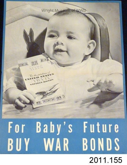 Poster, US Treasury, 1943. Shows black and white photographic image of a baby holding a savings bond stamp album. "For Baby's Future / BUY WAR BONDS" in white print on blue background at bottom of poster.Update Date