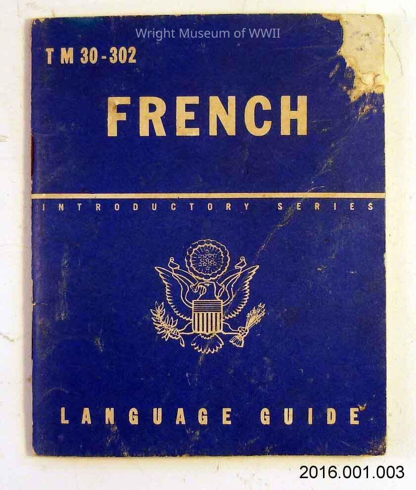 Booklet, training, TM 30-302, French Language Guide. Paperback booklet of English phrases and their translations into French, phonetically. 62 pages. Published by the War Department 21 June 1943.Update Date