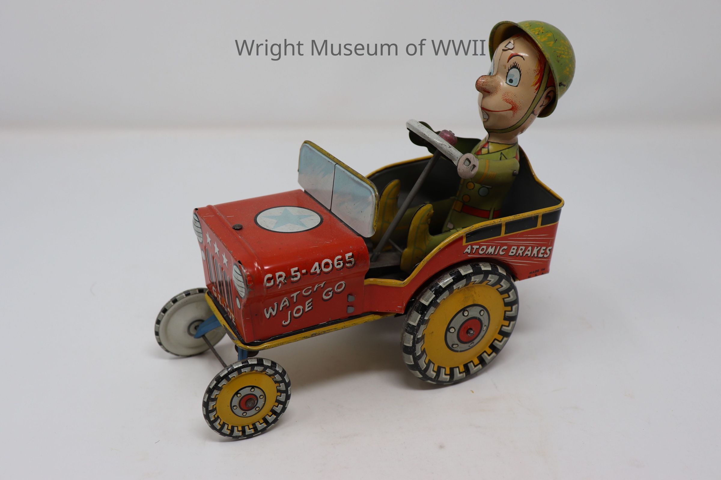 G.I. Joe "Watch Joe Go" children's tin toy with a functioning wind-up mechanism, rolling wheels, and a bouncing driver