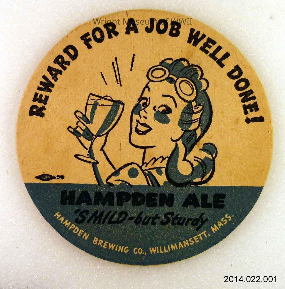 Coaster, Beer, civilian, Hampden Ale. A coaster made of pressed paper, featuring a young lady holding a beer. The young lady is wearing goggles, indicating she is a war worker. The text on the coaster reads "Reward for a job well done" around the top perimeter and at the bottom "Hampden Ale 's mild-but sturdy" and around the bottom "Hampden Brewing Co., Willimansett, Mass." The print is executed in blue, black and white.Update Date