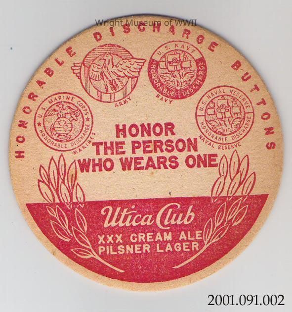 Round cardboard drink coaster advertising beer on one side. Printed in red ink: "HONORABLE DISCHARGE BUTTONS". At center: "HONOR THE PERSON WHO WEARS ONE". Four discharge emblems for U.S. Marine Corps, U.S. Army, U.S. Navy, and U.S. Naval Reserve are near top. Bottom third is red with two branches and white lettering "Utica Club / XXX CREAM ALE / PILSNER LAGER".Update Date