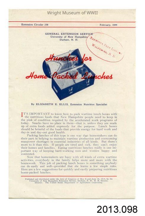 Pamphlet, informational. Titled "Hunches for Home-Packed Lunches". Produced by the University of New Hampshire Extension Service, Durham, NH, February, 1944. Extension Circular 258. Written by Elizabeth E. Ellis, Extension Nutrition Specialist. Blue and red print on white glossy paper; 8 pages, bound with a staple at spine. Stamp on front: '"Brewster Free Library, Wolfeboro, NH". Contains information on packing "wartime lunchboxes" with nutritious lunches. Includes instructions and recipes.Update Date